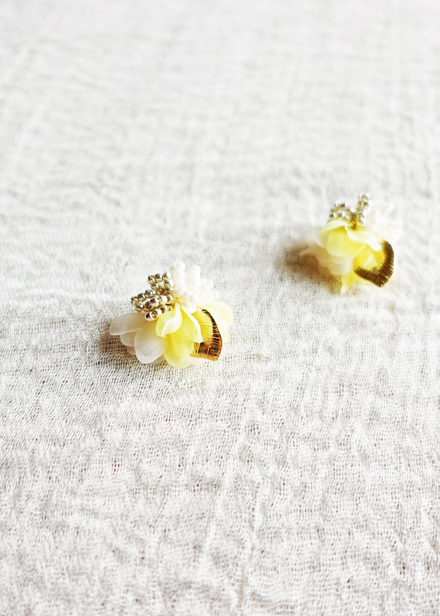Aurea Bloom Earrings are handcrafted with fine cordonnet cotton thread and delicate glass beads using our signature crocheted technique. Soft white and yellow hues form sculptural floral charms, each accented with a gracefully shaped gold leaf.