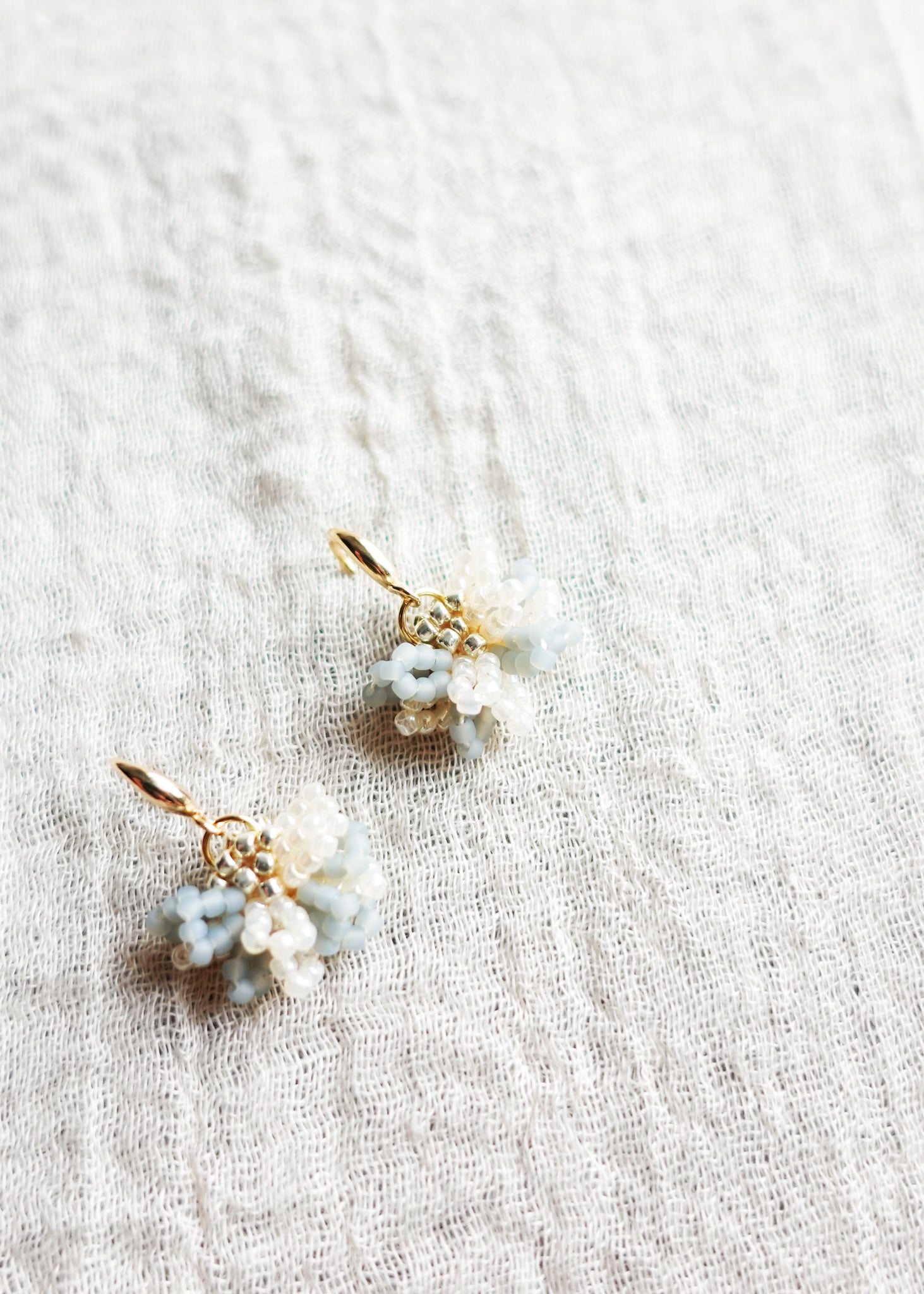 Camellia Bicolor Drop Earrings in Blush Pink feature delicately crocheted charms suspended from gold-plated hooks. Each piece is patiently shaped by hand, creating a soft, sculptural form that feels light yet tactile.