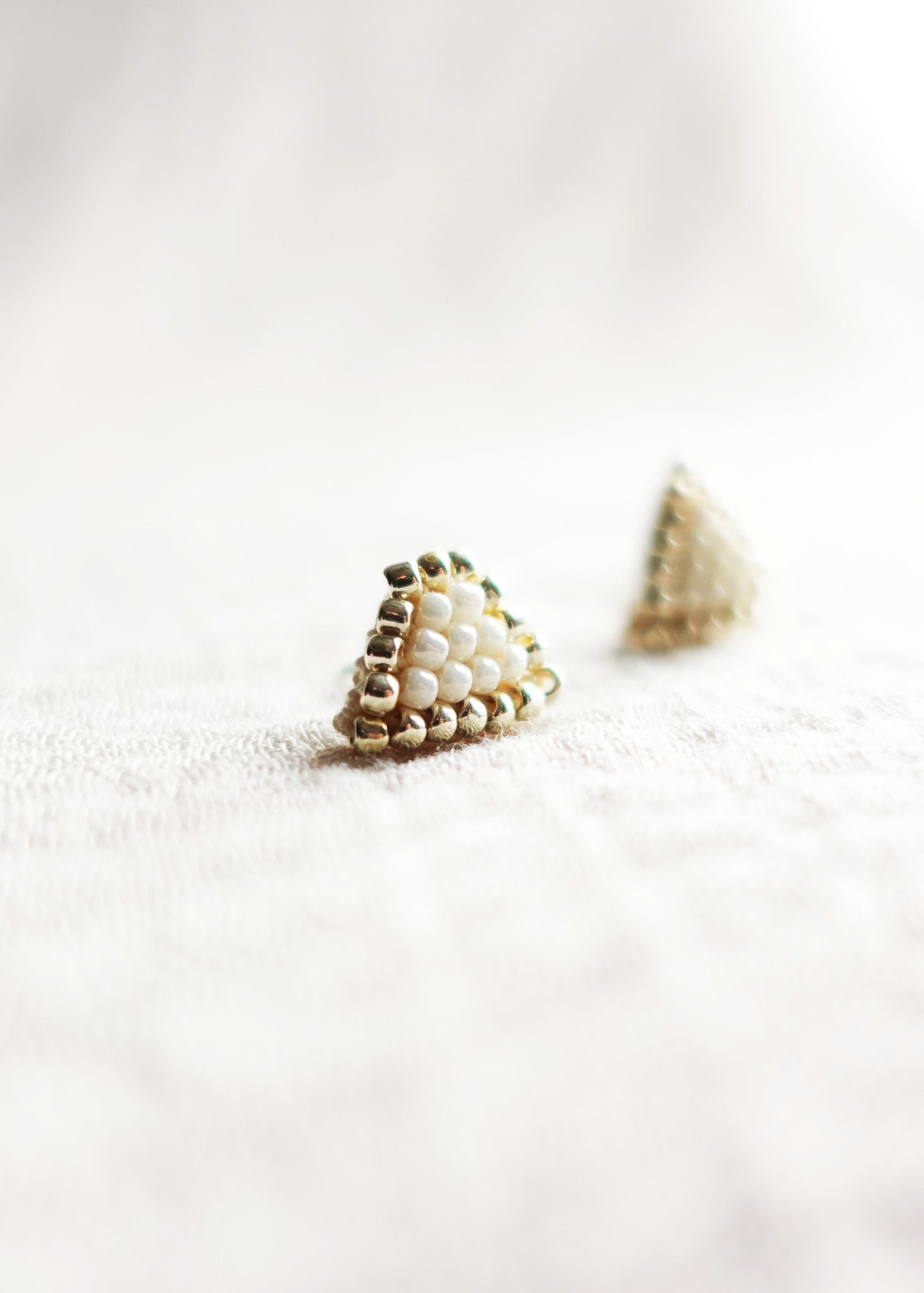 These stud earrings feature a distinctive triangle shape with a flat top, showcasing intricate crochet work in pearl white. Each piece is framed with shiny gold beads, adding a polished finish that enhances the earthy tones. Handcrafted with fine cordonnet cotton thread, they bring a unique geometric elegance to any look.