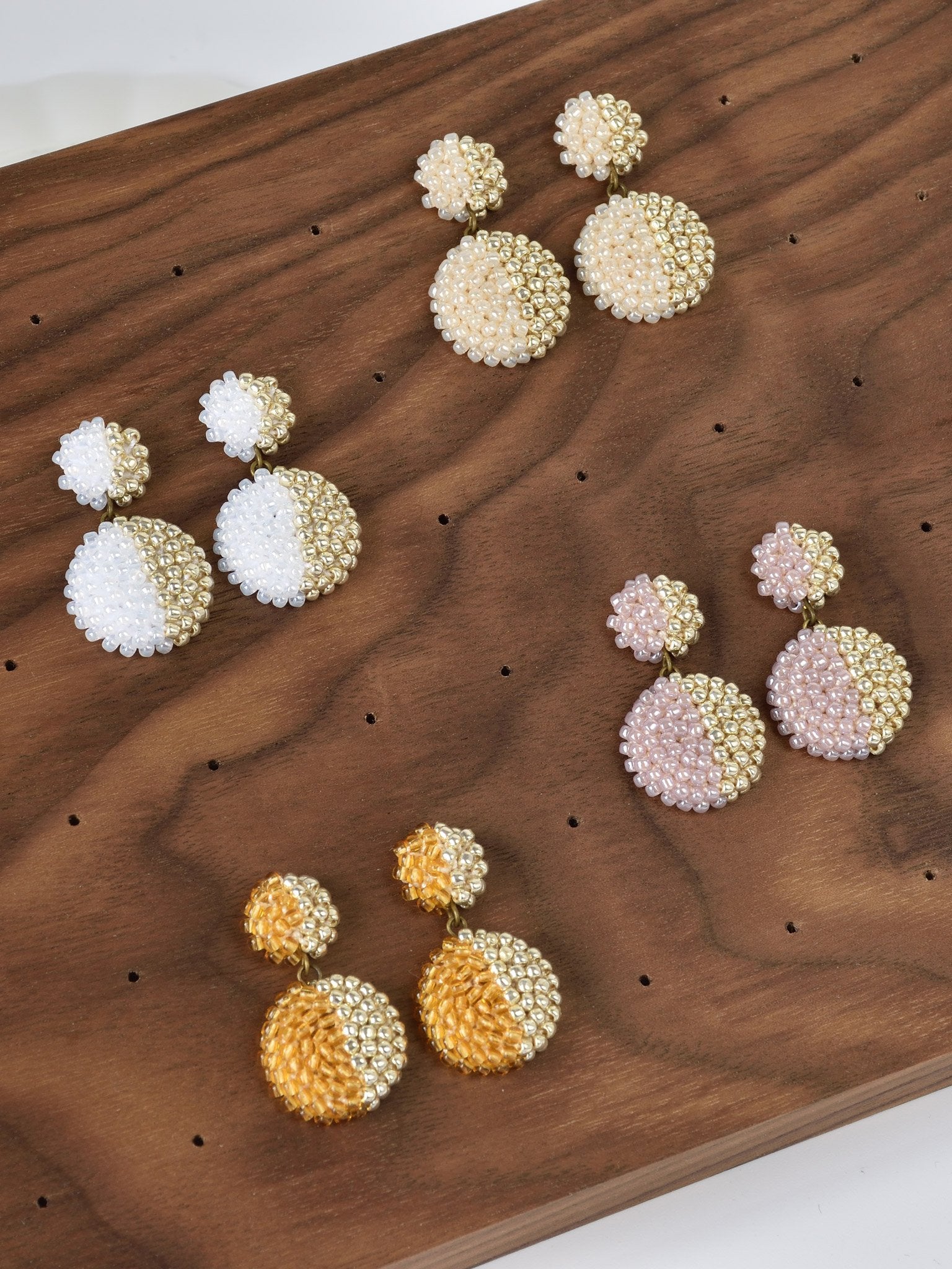 White and gold colored seed beads are crocheted into two double beaded circle charms. With the bigger charms hanging below the smaller ones to create a beautiful pair of drop earrings.