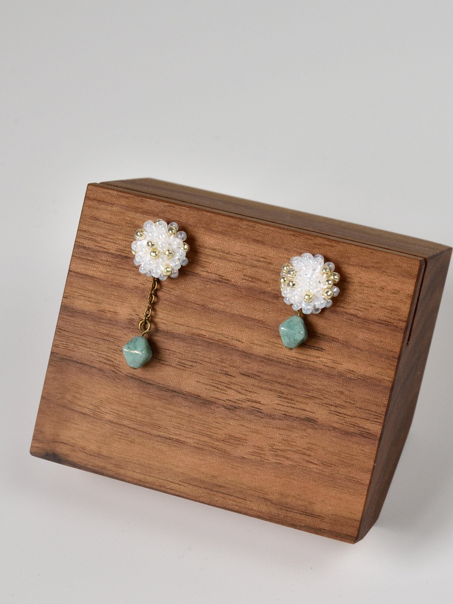 Petite crocheted beads studs with shiny gold details. Jade green bead charm from Czech hangs from below. Subtle mismatched earrings design.