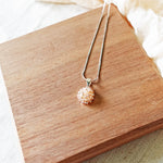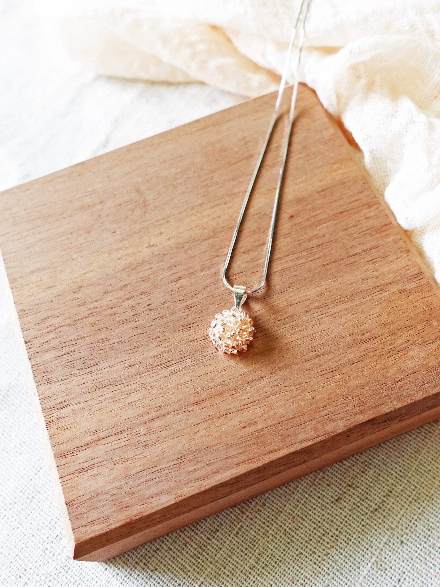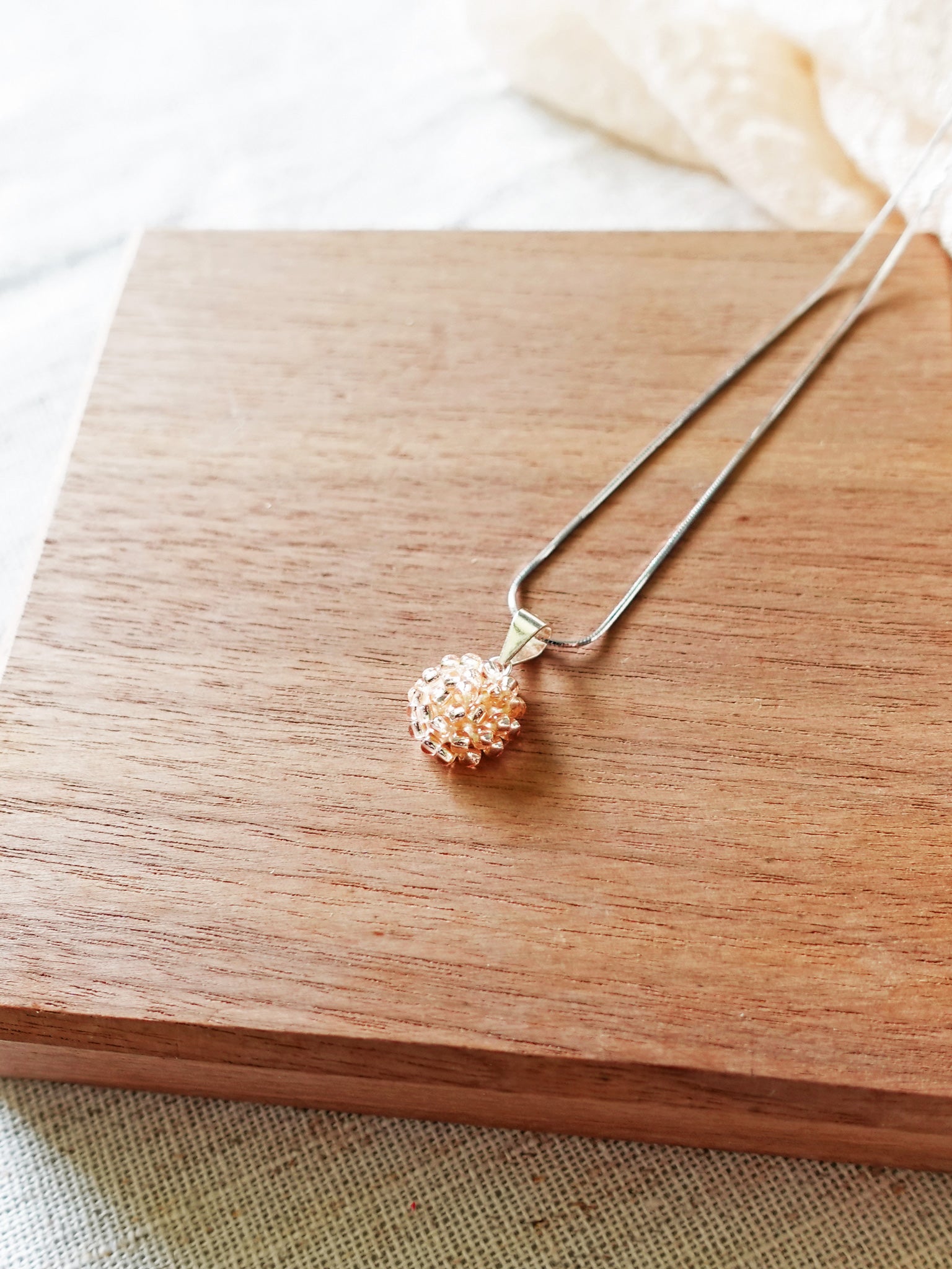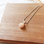 Beaded charm in brilliant champagne pink color, on a sterling silver chain.