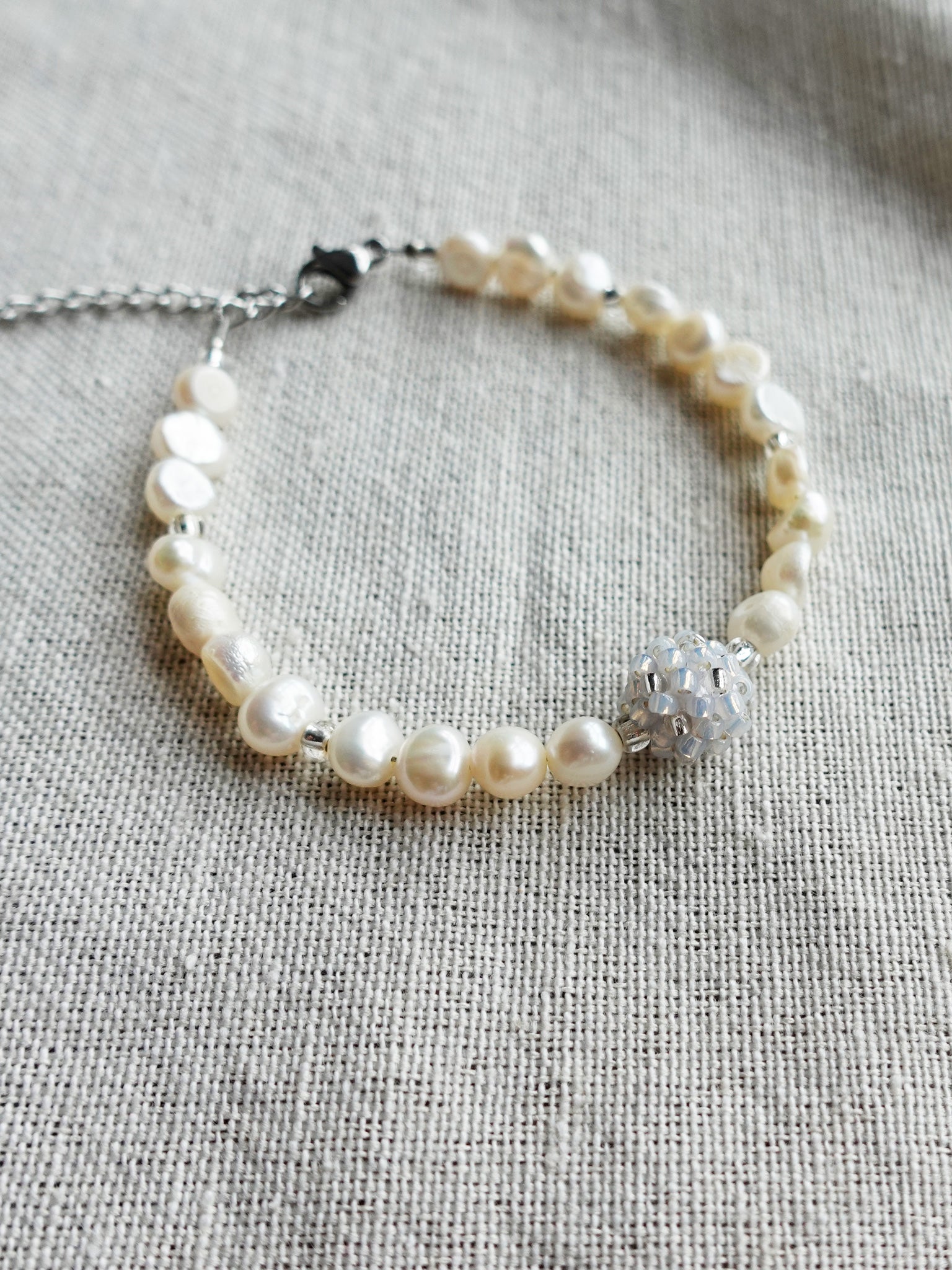 The Arwen Bracelet in Grey exudes sophistication and exclusivity with its freeform freshwater pearls and crocheted orb charm adorned with elegant grey and silver glass beads. Adding to its allure, a delicate chain accented with Czech fire polish crystals elegantly swings with every movement.