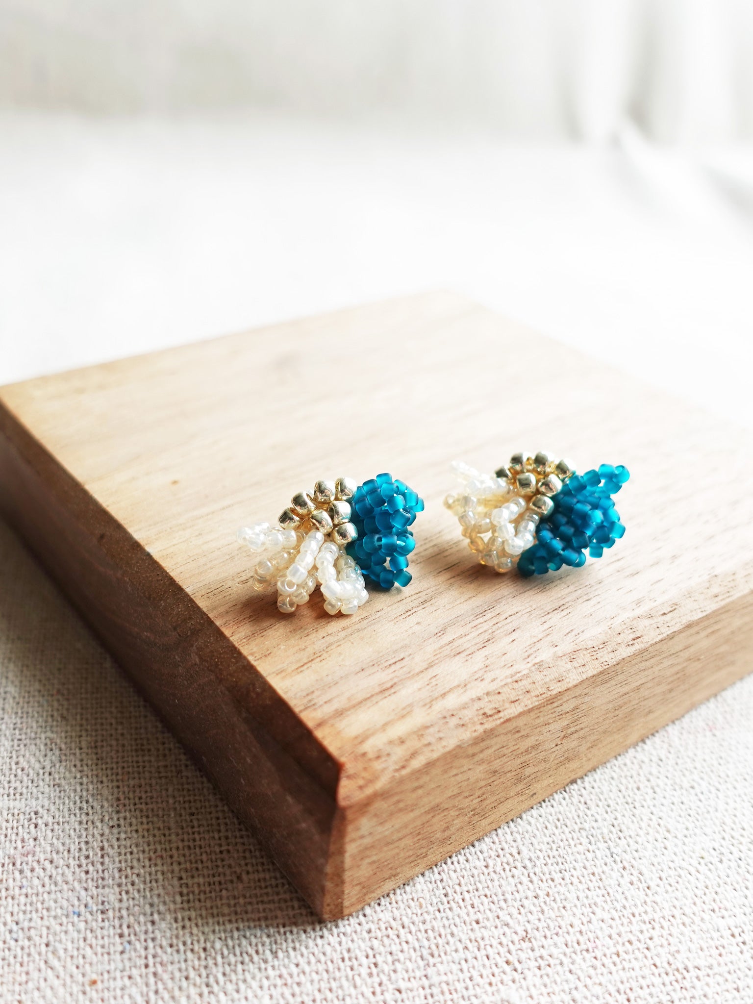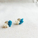 These stud earrings feature a combination of ivory and teal, adorned with a gold crown.