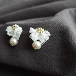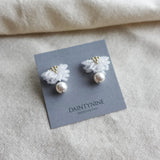 Fluffy studs of cloud white, with a gold crown. Silky crystal pearls drop below.