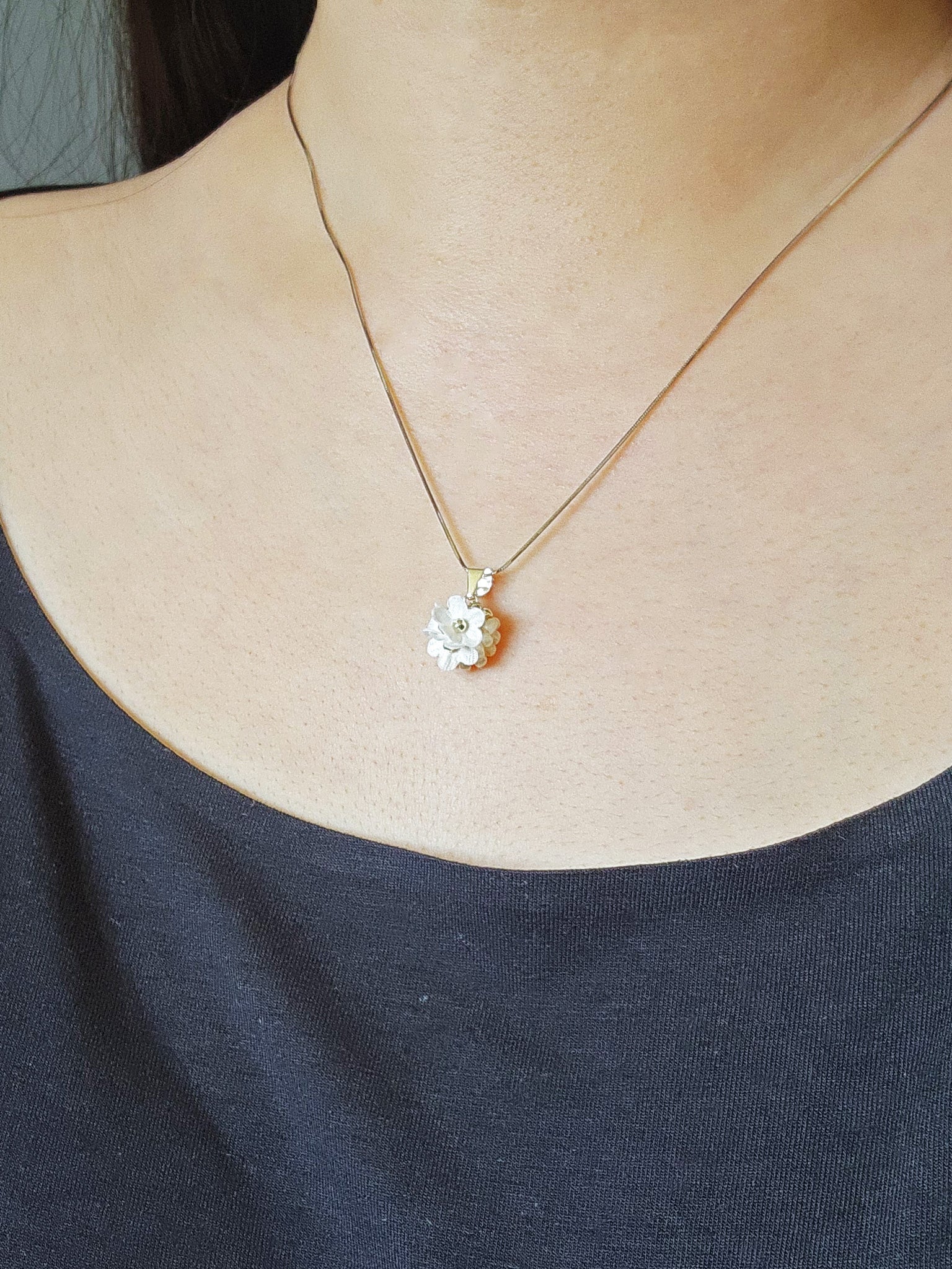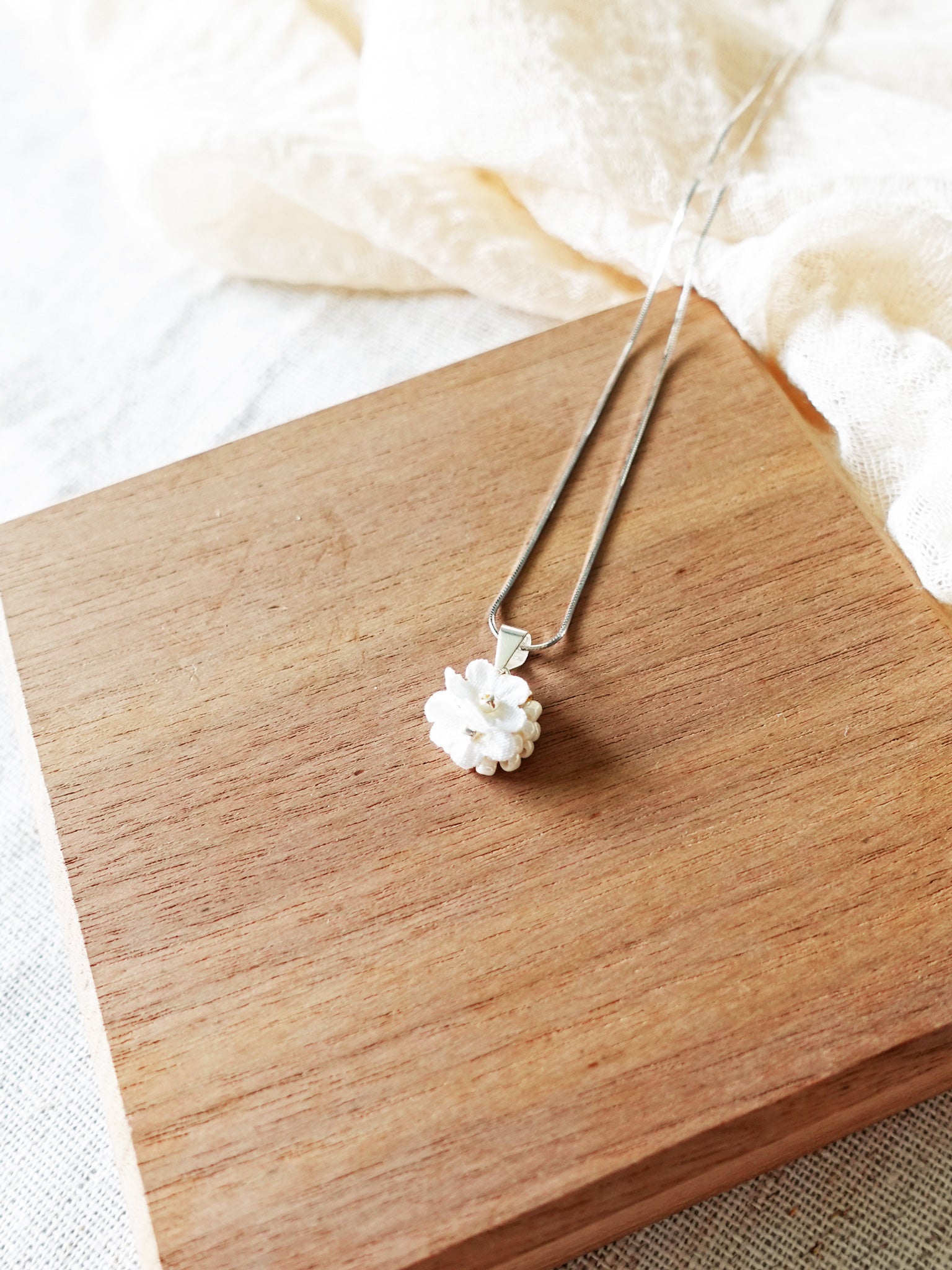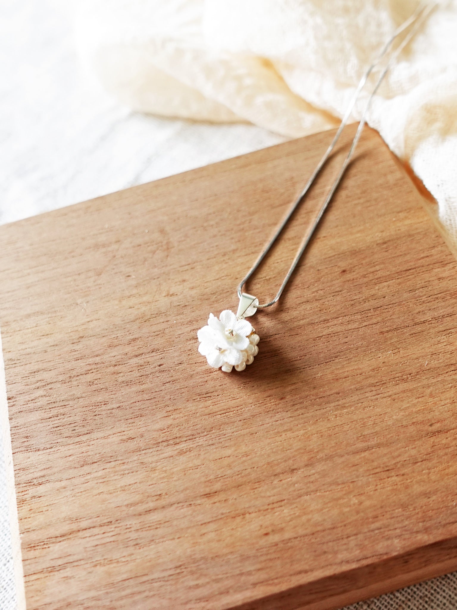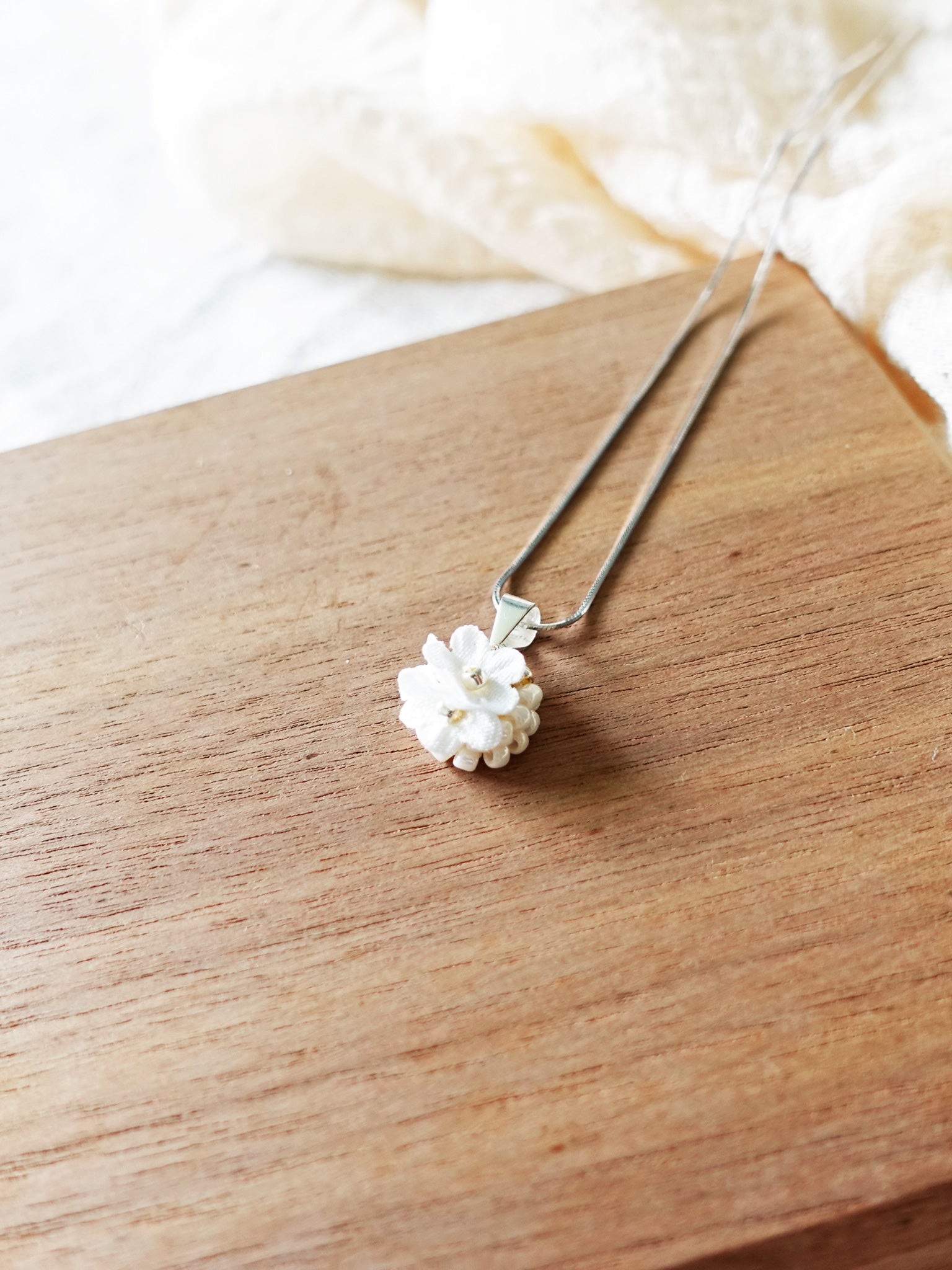 Intricate crochet work using delicate fabric flowers and glass beads in elegant shades of white and gold. On a sterling silver chain.