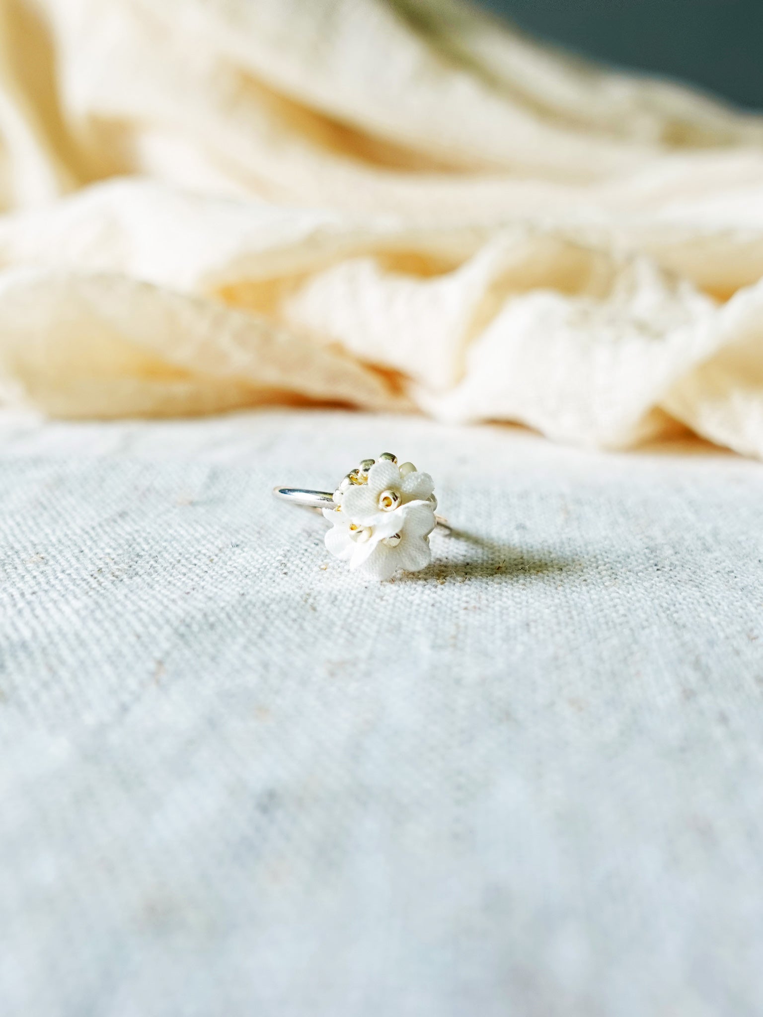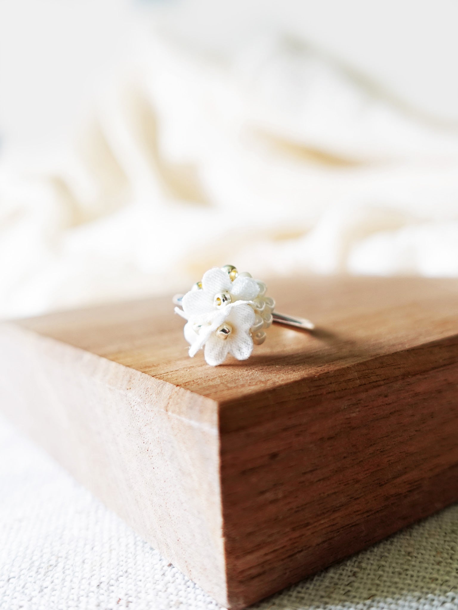 Intricate crochet work using delicate fabric flowers, and glass beads in elegant shades of white and gold.
