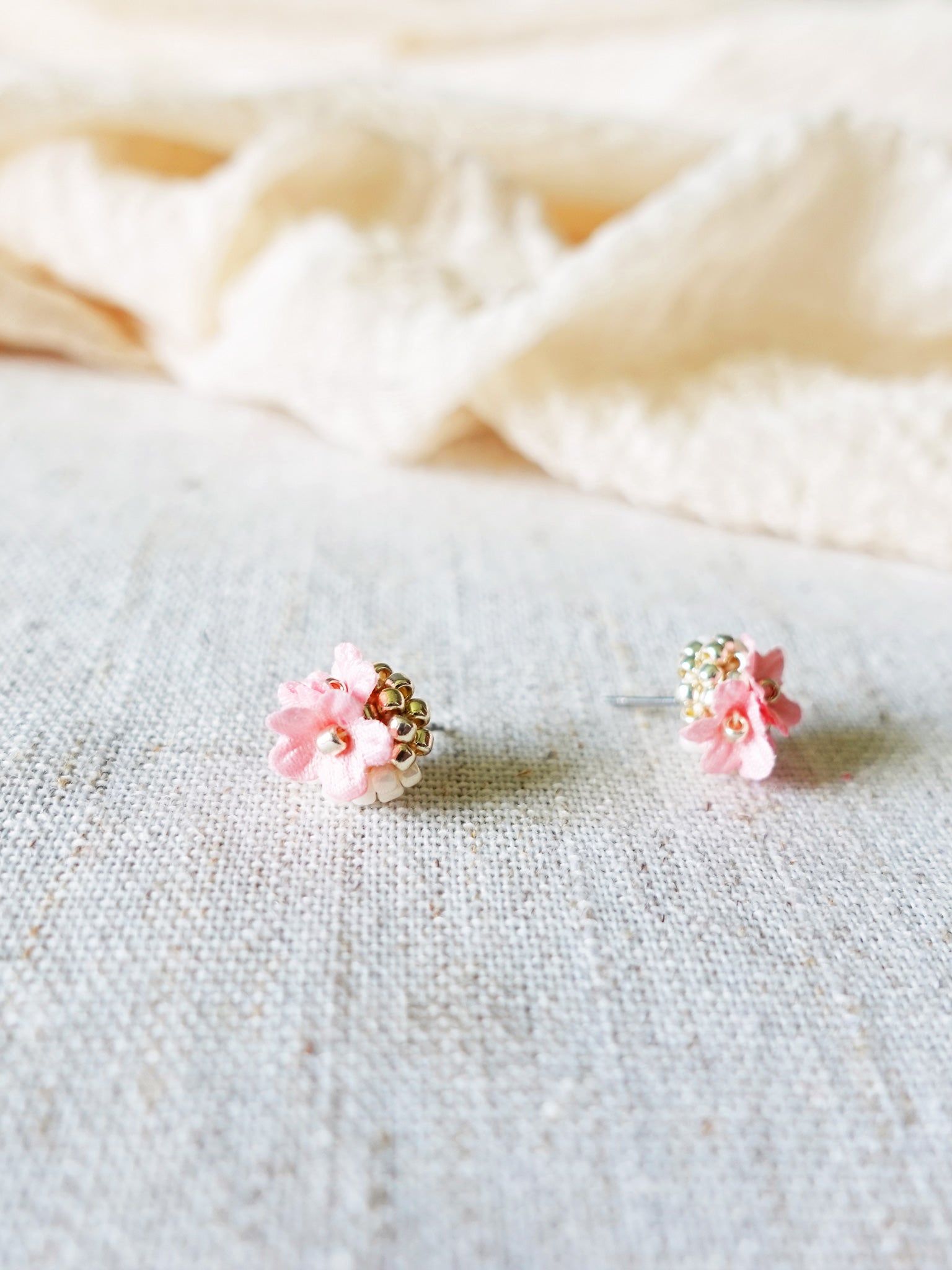These earrings feature intricate crochet work using delicate fabric flowers and glass beads in elegant shades white and gold.