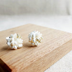 These earrings feature intricate crochet work using delicate fabric flowers, freshwater pearls and glass beads in elegant shades of white, ivory, and gold.