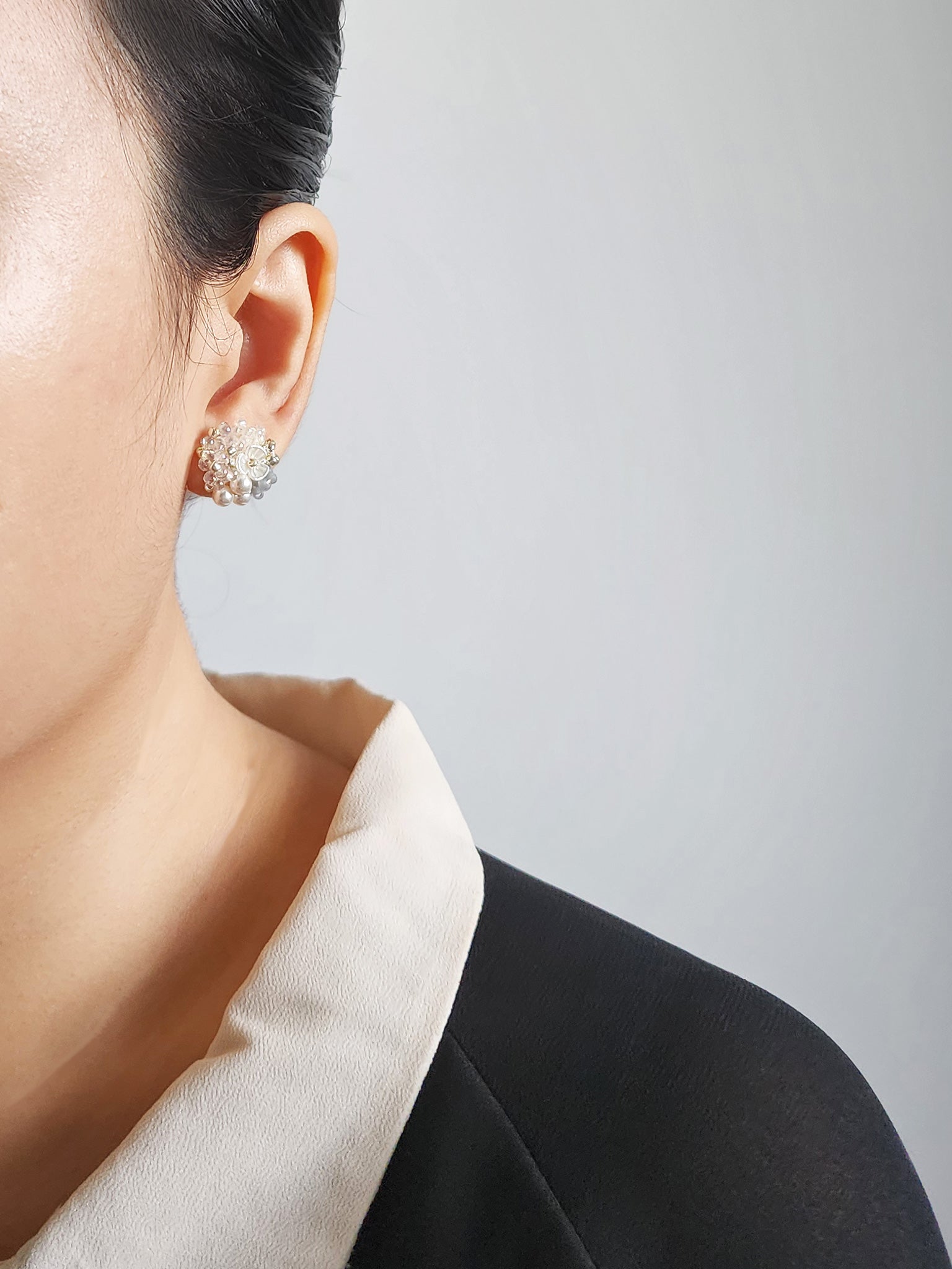 Crafted with dainty flowers, iridescent glass beads, luxurious Swarovski pearls, and ivory, gold, and smoke grey seed beads.