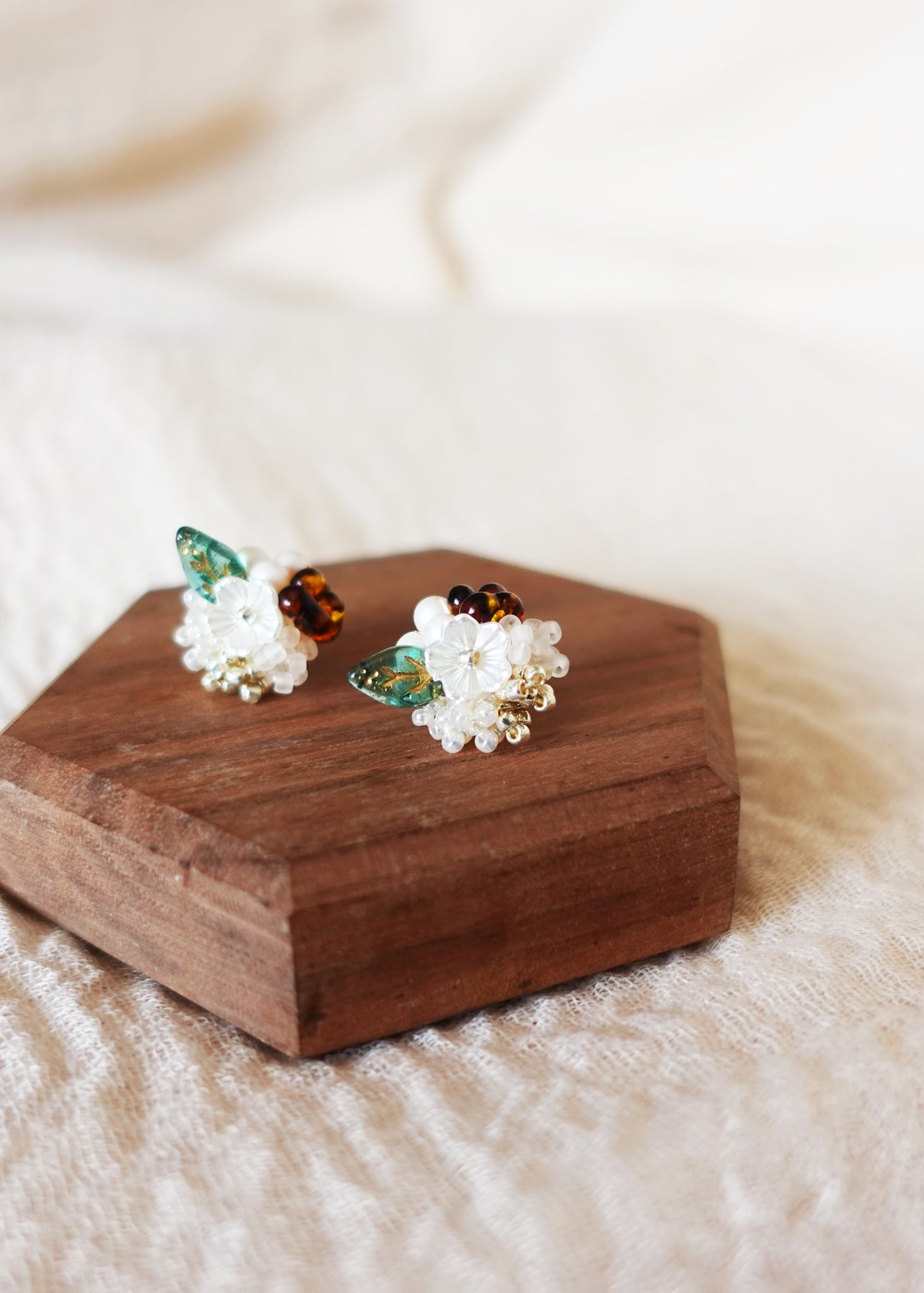 Handcrafted with fine cordonnet cotton thread and delicate glass beads using our signature crocheted technique, the Dewleaf Earrings feature a graceful white flower paired with blue-green leaves. Accented with a soft blend of white, ivory, and gold beads, and grounded by warm brown glass beads, each pair evokes the quiet beauty of morning light on dew-kissed petals. Thoughtfully crocheted by hand, they capture a sense of calm elegance and natural harmony — a refined expression of artisanal craftsmanship.