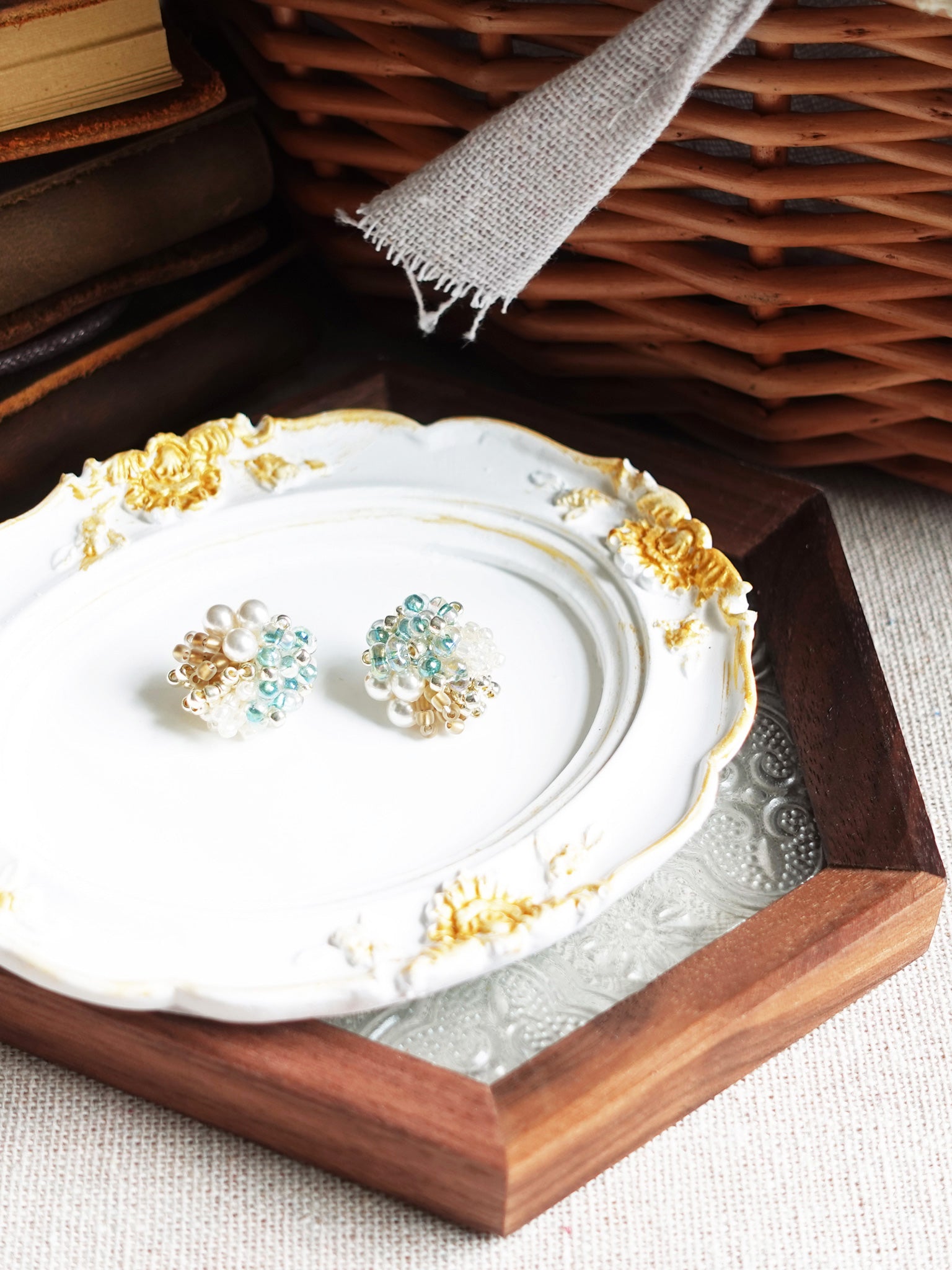 Elegant pair of earrings with teal-lined glass beads and frosted champagne seed beads, completed with Swarovski crystal pearls.