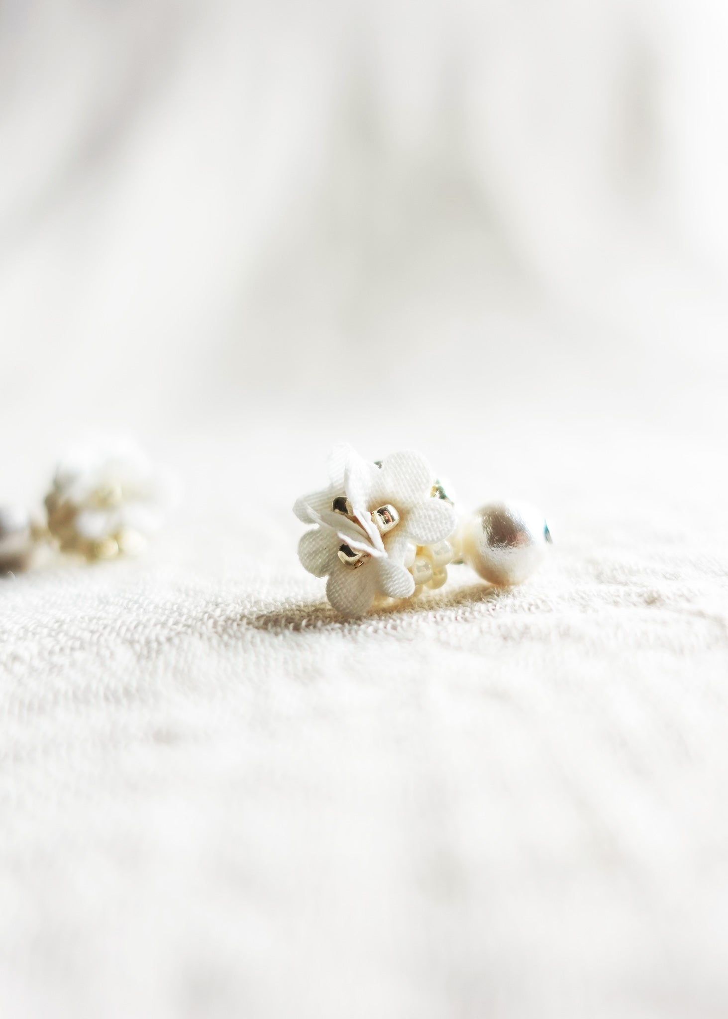 Cyme Petite Snowball Earrings in White feature intricate crochet charms crafted from delicate fabric flowers and glass beads in soft white and gold tones. Beneath each charm, a cotton pearl drops gracefully, adding gentle movement and subtle luminosity.