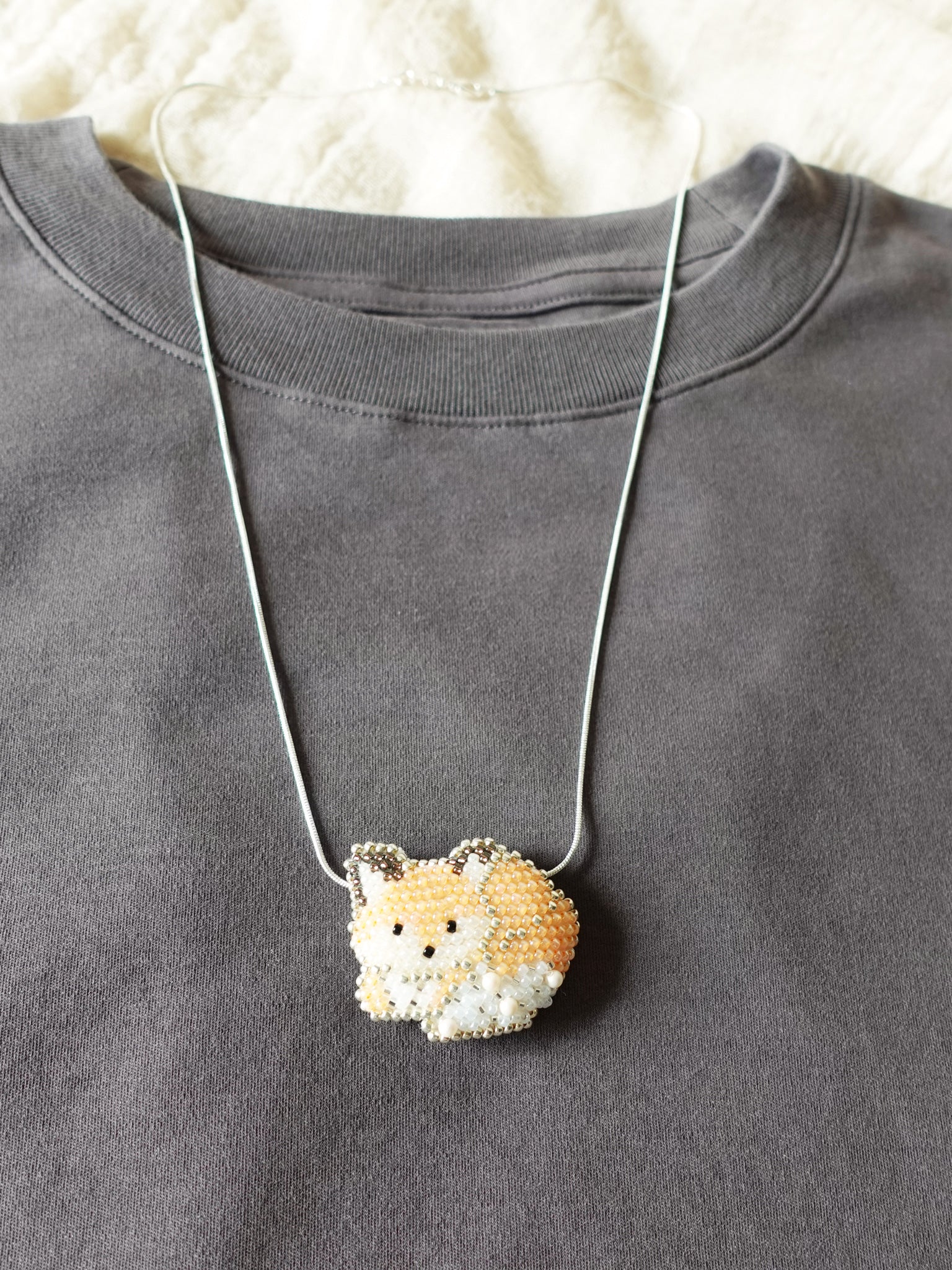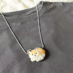 Make a statement with a touch of woodland whimsy. This fox loaf necklace features a beautifully handcrafted pendant made with fine cotton cordonnet thread, glass beads, and accented with Swarovski crystal pearls. The delicate crochet stitches capture the fox’s curled loaf posture with charm and elegance.