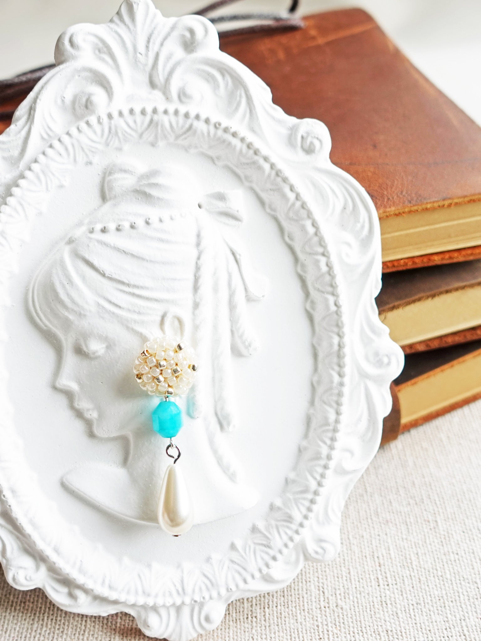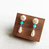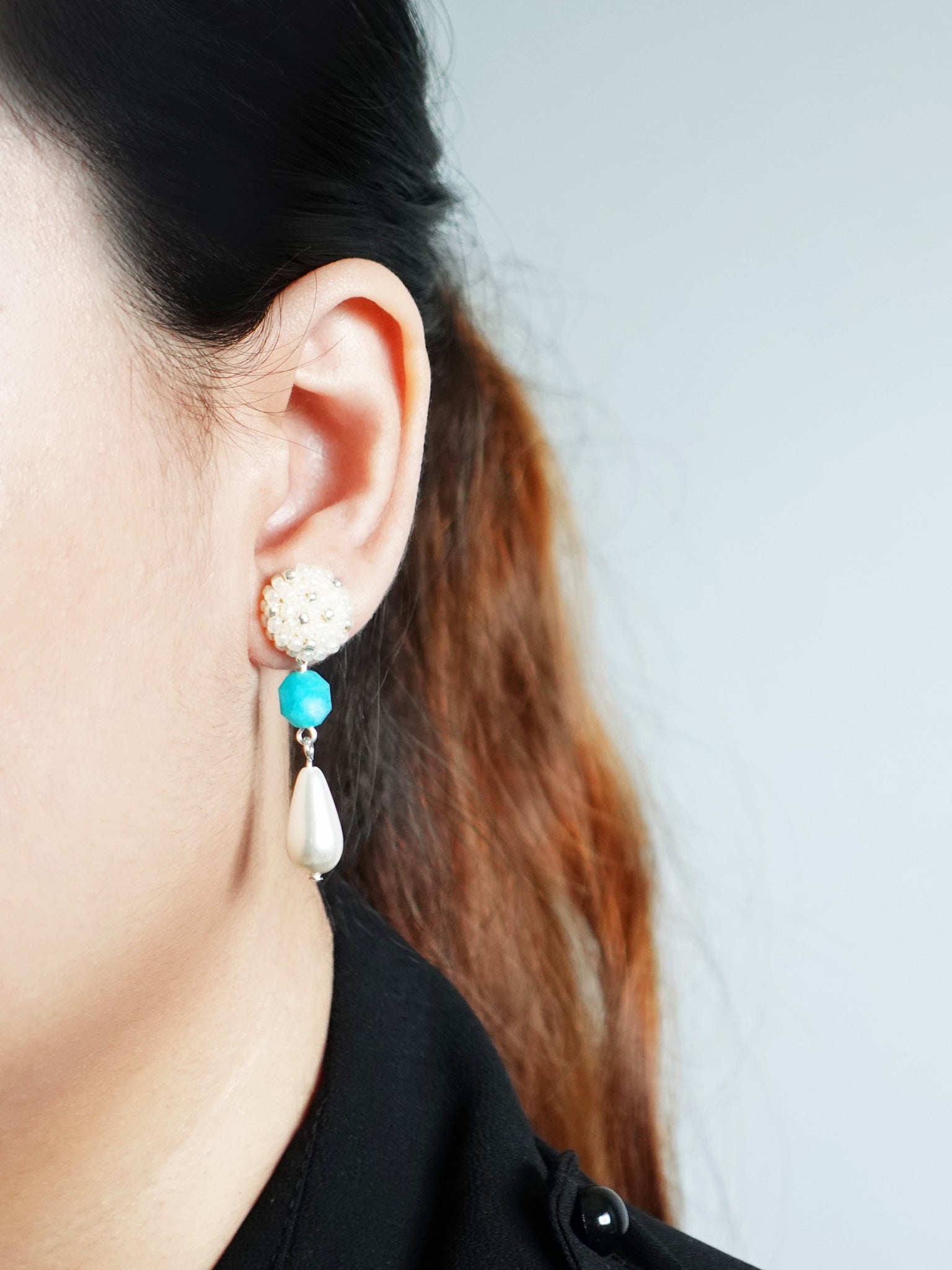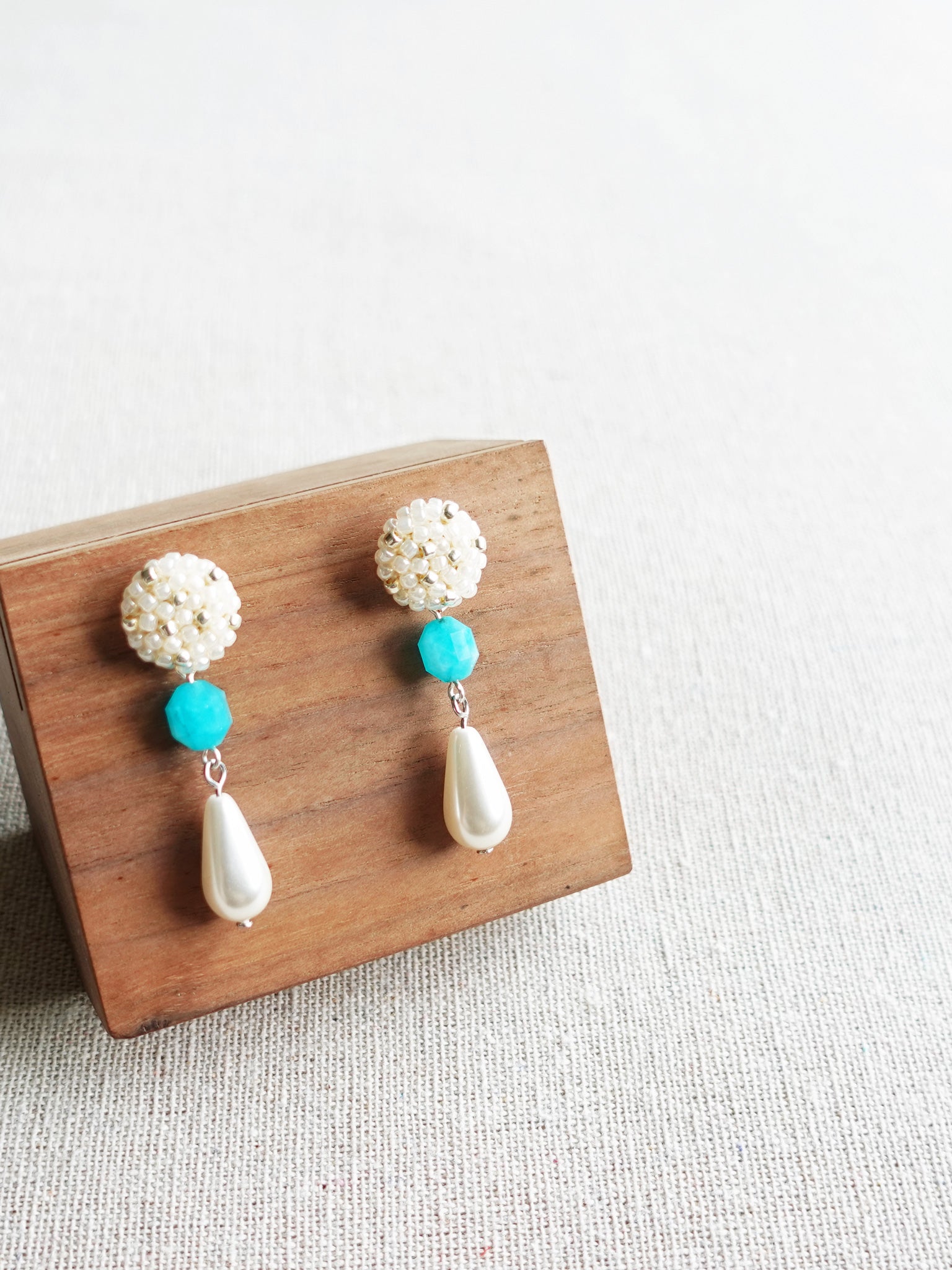 Indulge in a luxurious look with these exquisite earrings adorned with crocheted glass seed beads, complemented by Amazonite gemstones and cascading crystal pearls in a teardrop shape.