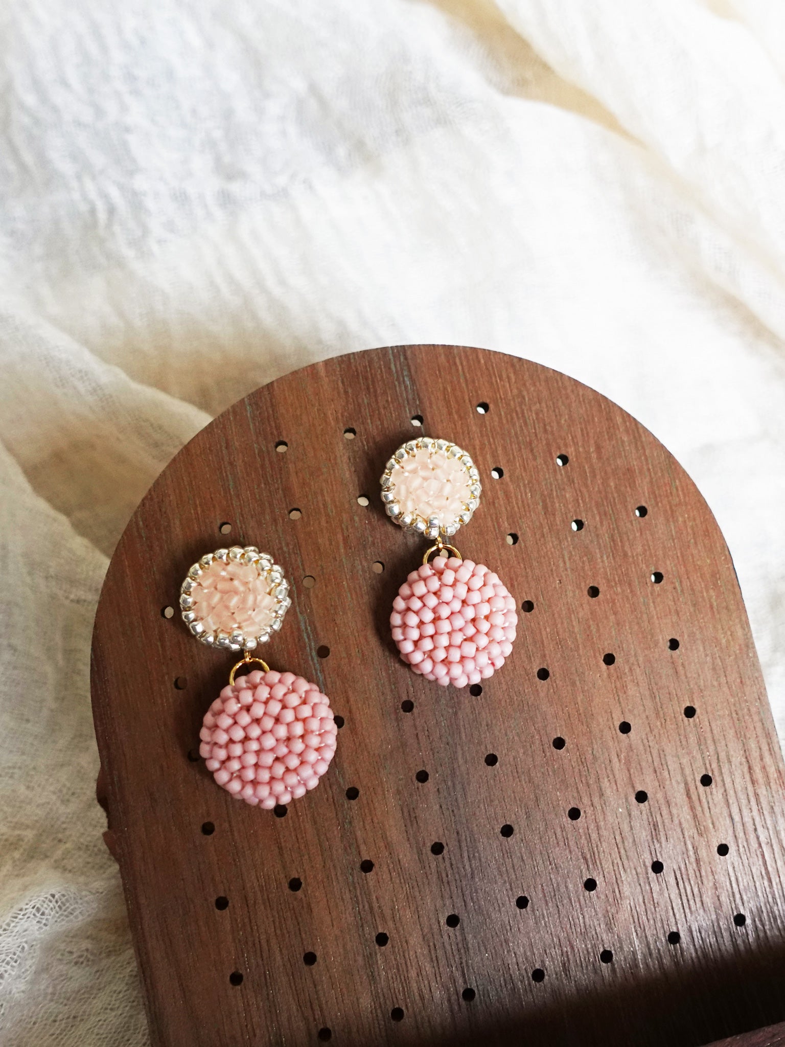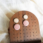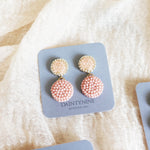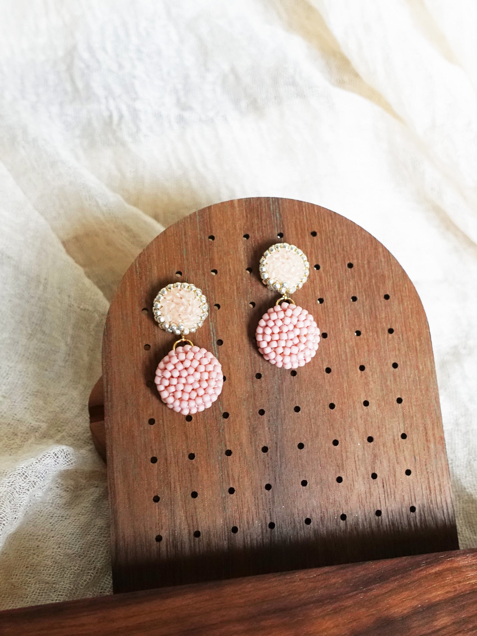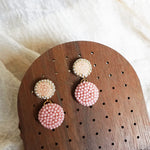 The Josie Drop Earrings in Blush Pink showcase beautiful blush pink beads crocheted within shiny gold frames, complemented by a matte pink charm that dangles gracefully below. Each earring is meticulously handcrafted with delicate glass beads and cordonnet cotton thread, creating a lightweight yet striking accessory. Ideal for those who appreciate unique, elegant pieces that effortlessly elevate both everyday outfits and special occasion ensembles, these earrings bring a refined, artisanal touch to your jewelry collection.