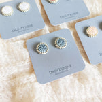 These round studs showcase intricate crochet work in smoke grey, framed by shiny gold beads for a polished finish. Handcrafted with fine cordonnet cotton thread, they bring a bold yet elegant touch, adding texture and timeless style to any outfit.