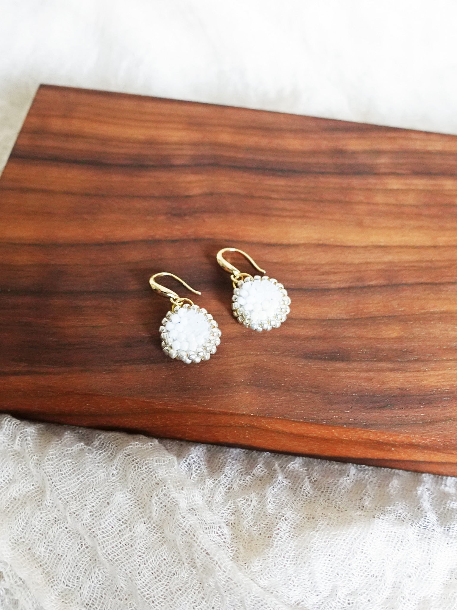These earrings showcase intricate crochet work in rich shades of white, framed by shiny gold beads for a refined touch. Handcrafted with fine cordonnet cotton thread, they combine delicate artistry with a bold yet elegant design. Suspended from an elegant gold hook, they bring texture, warmth, and timeless style to any outfit.