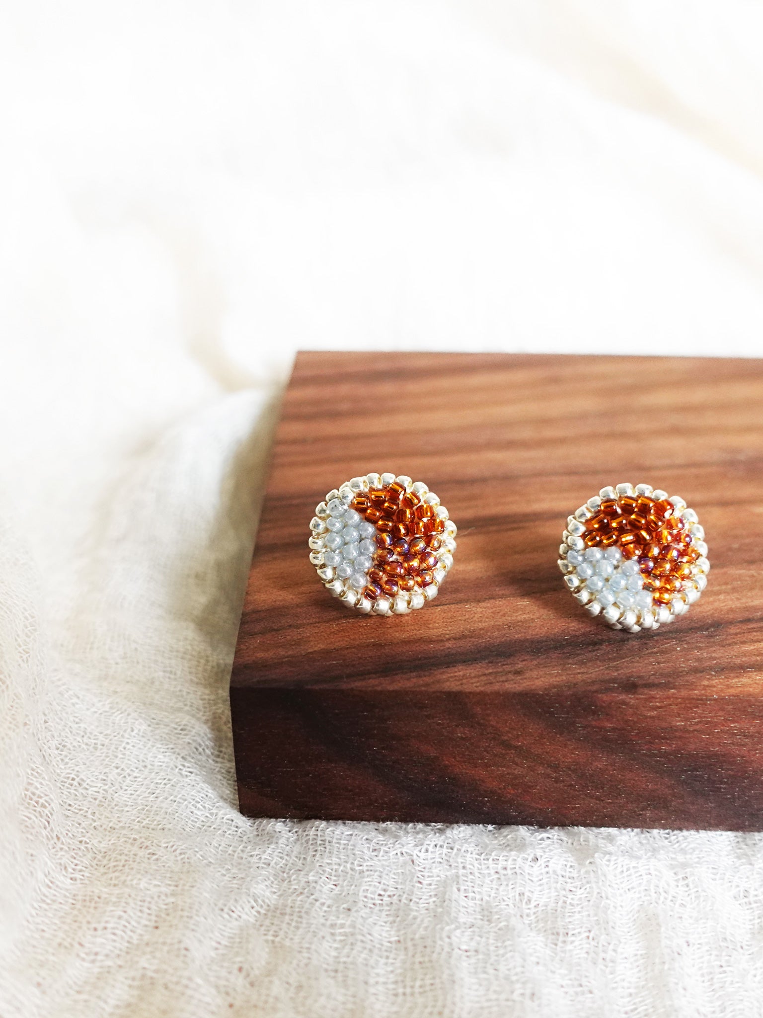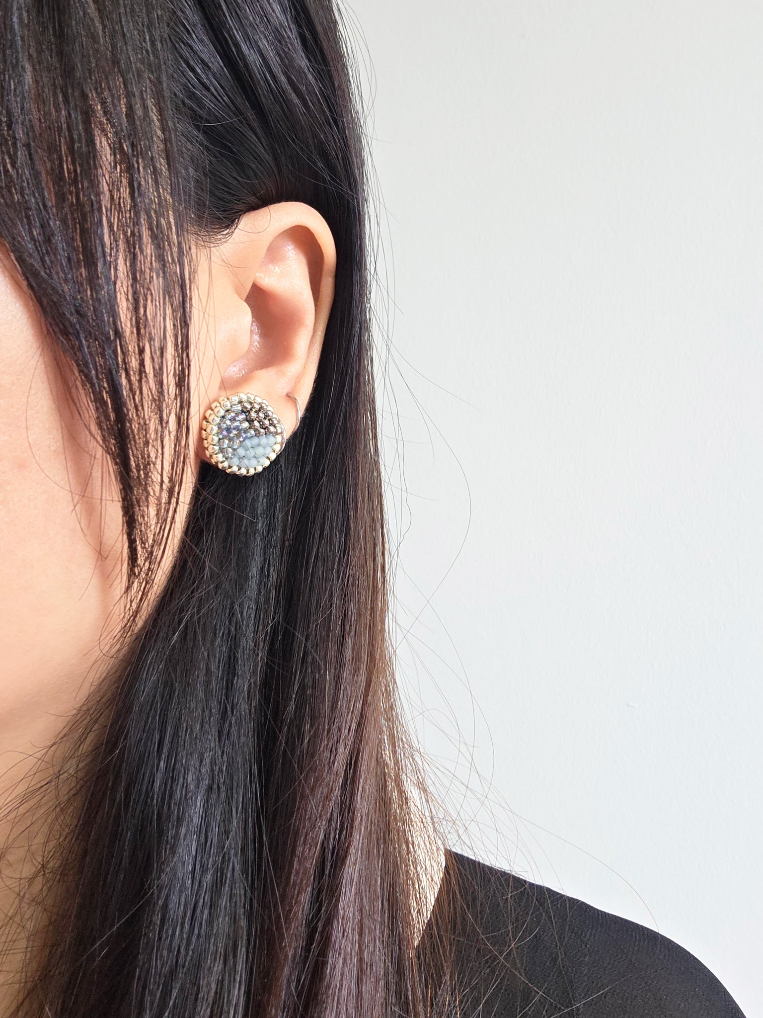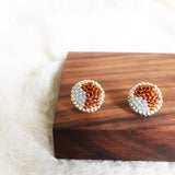 These statement round studs feature crochet work in rich shades of brown and grey, beautifully encapsulated in shiny gold beads. Handcrafted with fine cordonnet cotton thread, they offer a bold yet elegant accessory that adds texture and warmth to any outfit.