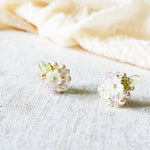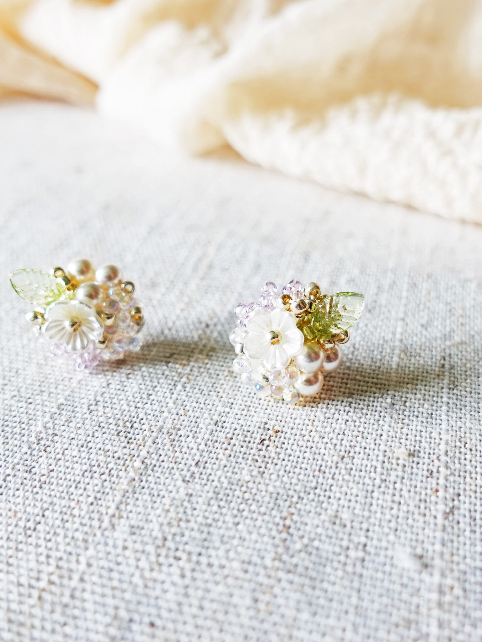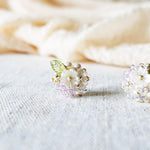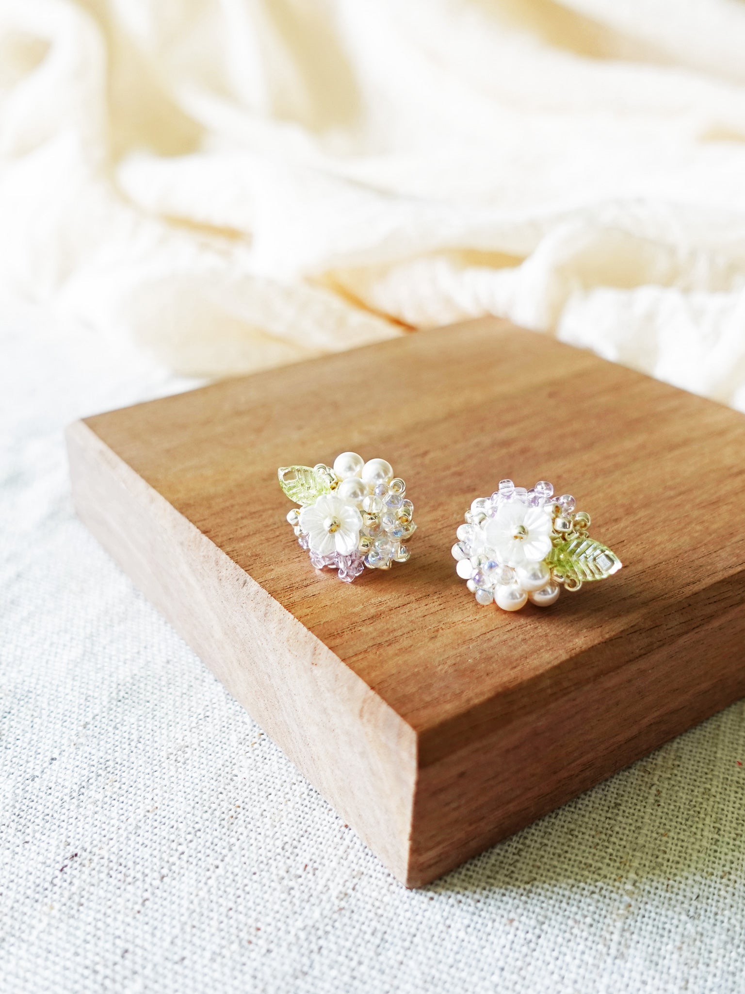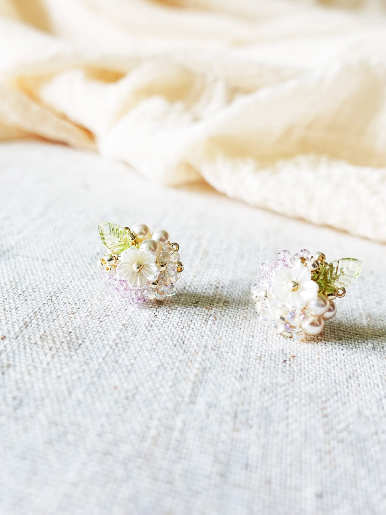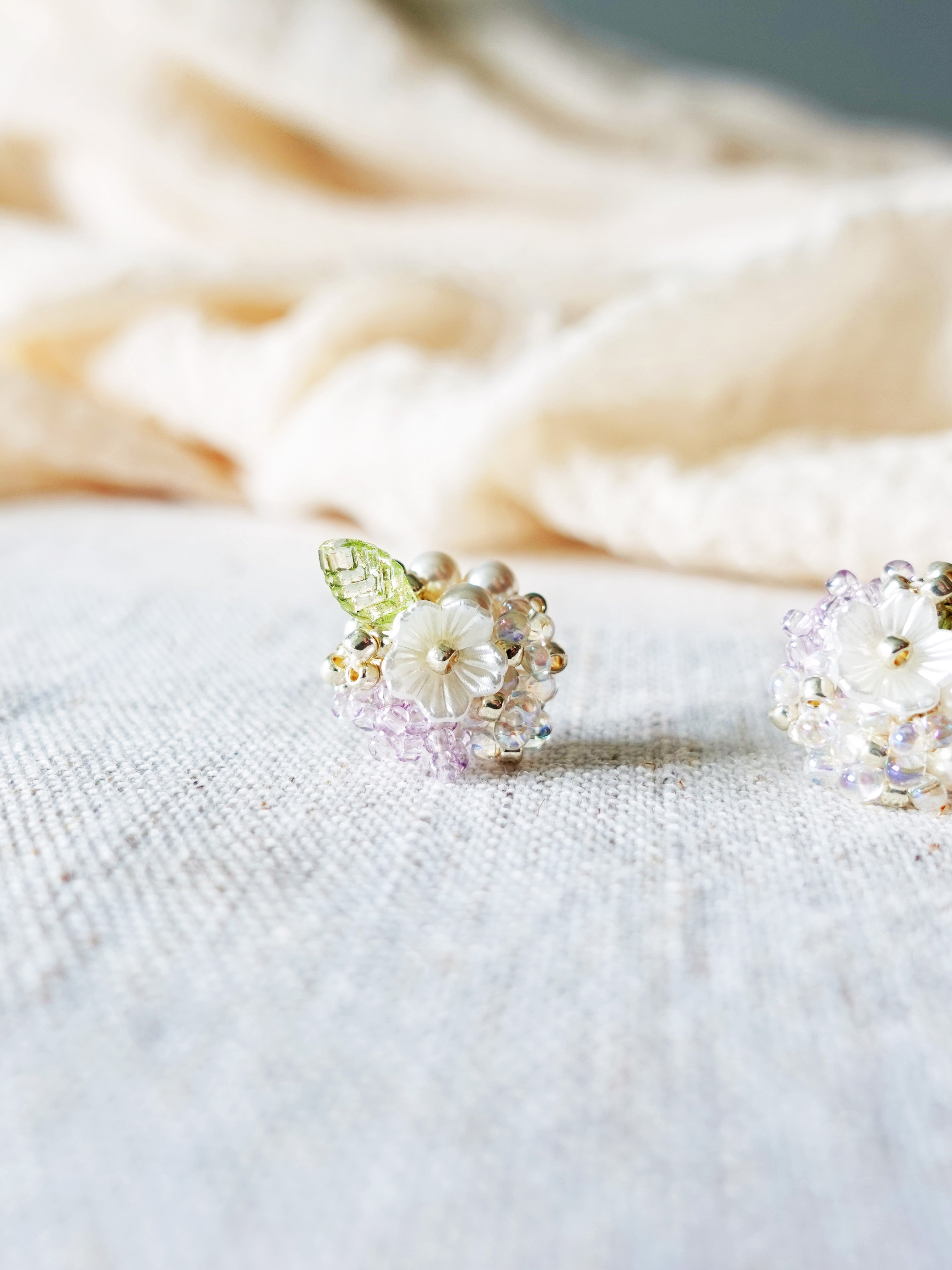 Crafted with dainty flowers and leaves, iridescent glass beads, luxurious Swarovski pearls, and purple and gold seed beads.