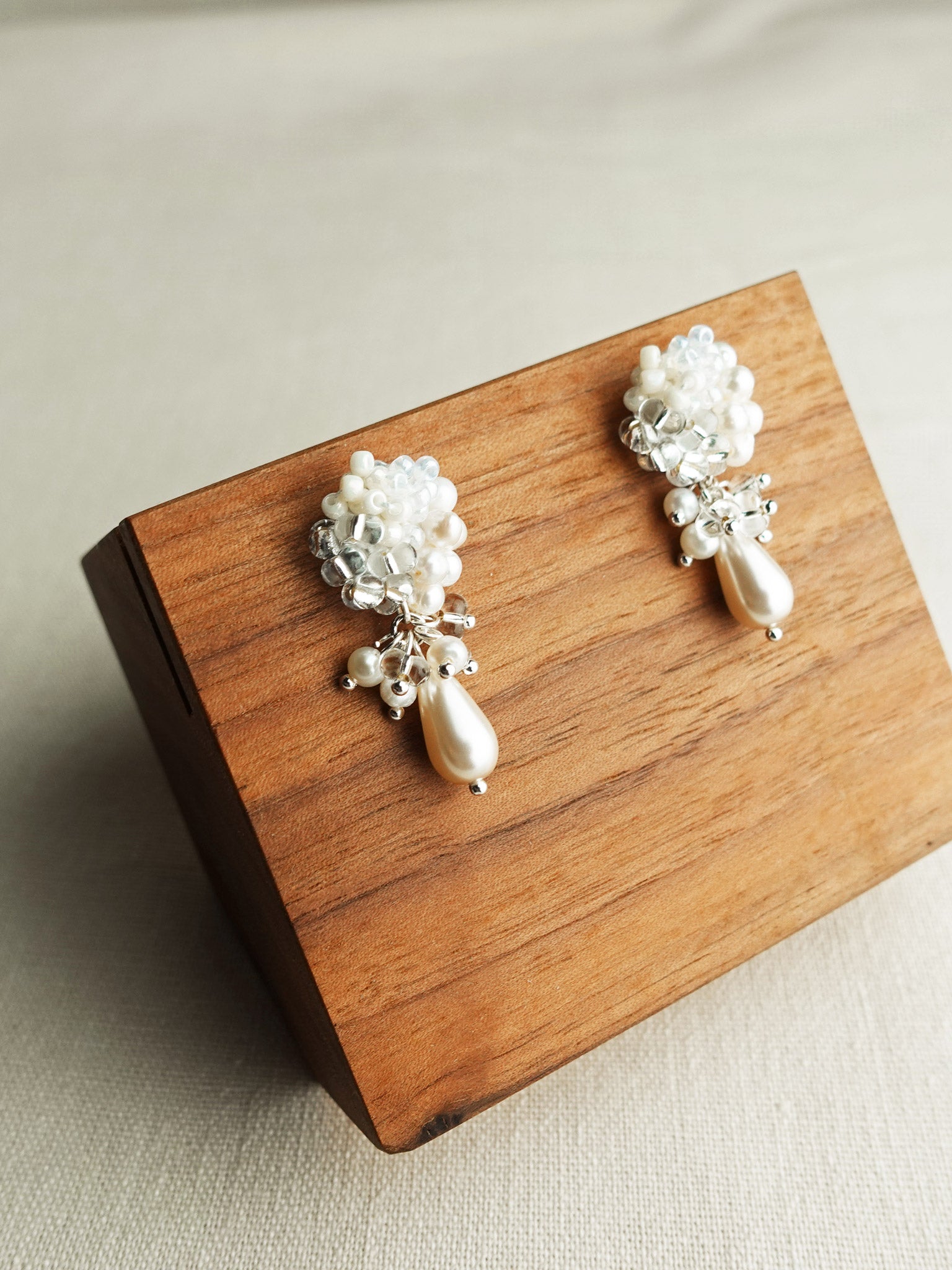 Cluster of freshwater pearls and clear beads gather, as the silky smooth teardrop shaped crystal pearls drop below.
