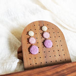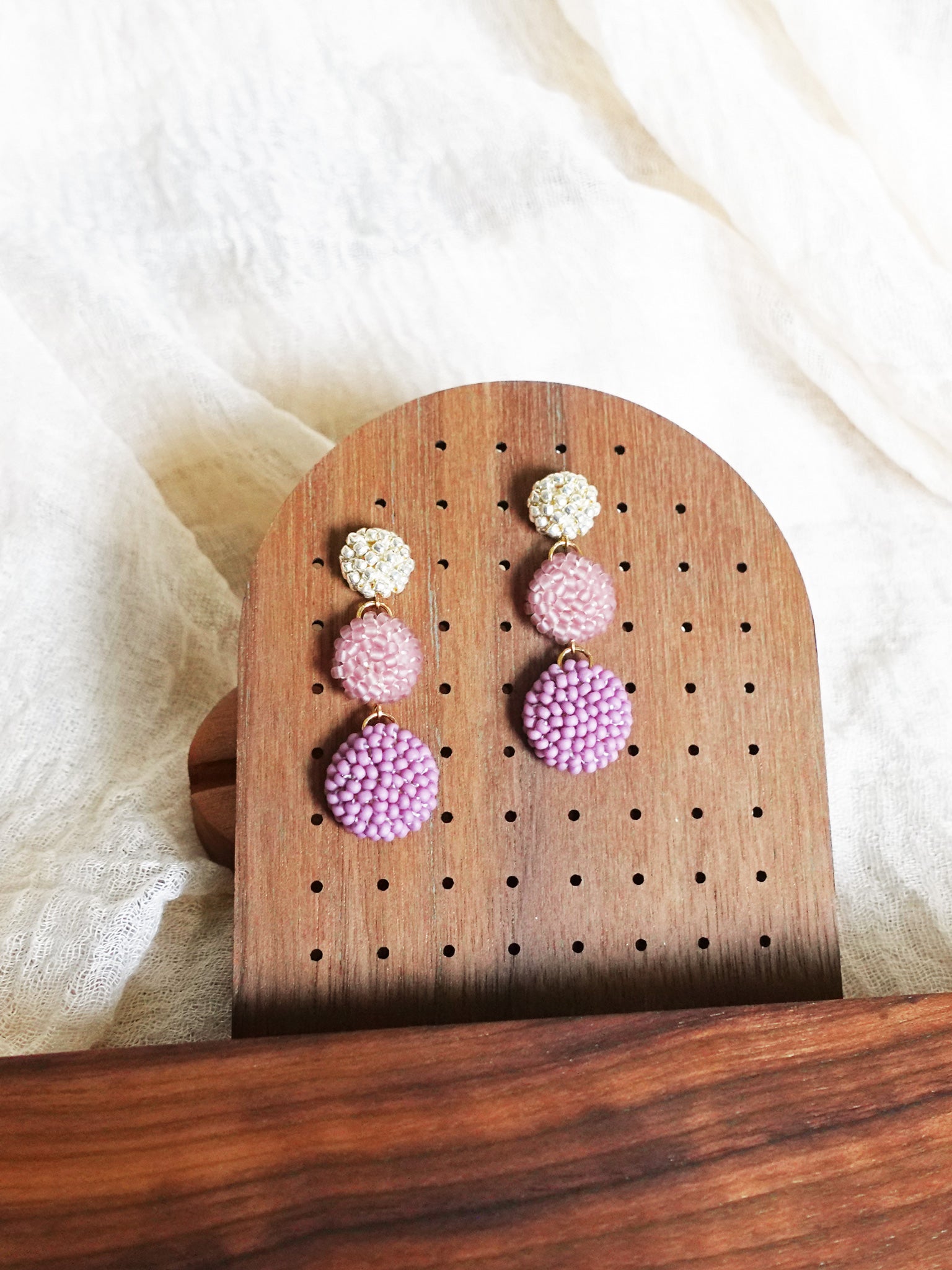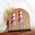 These dangle earrings feature three crochet charms in gold, mauve purple, and matte purple beads, creating a graceful layered look. Handcrafted with delicate glass beads and cordonnet cotton thread, they offer a lightweight and elegant accessory that adds subtle texture and color to any outfit. Perfect for those who appreciate unique, handmade jewelry with a sophisticated twist.