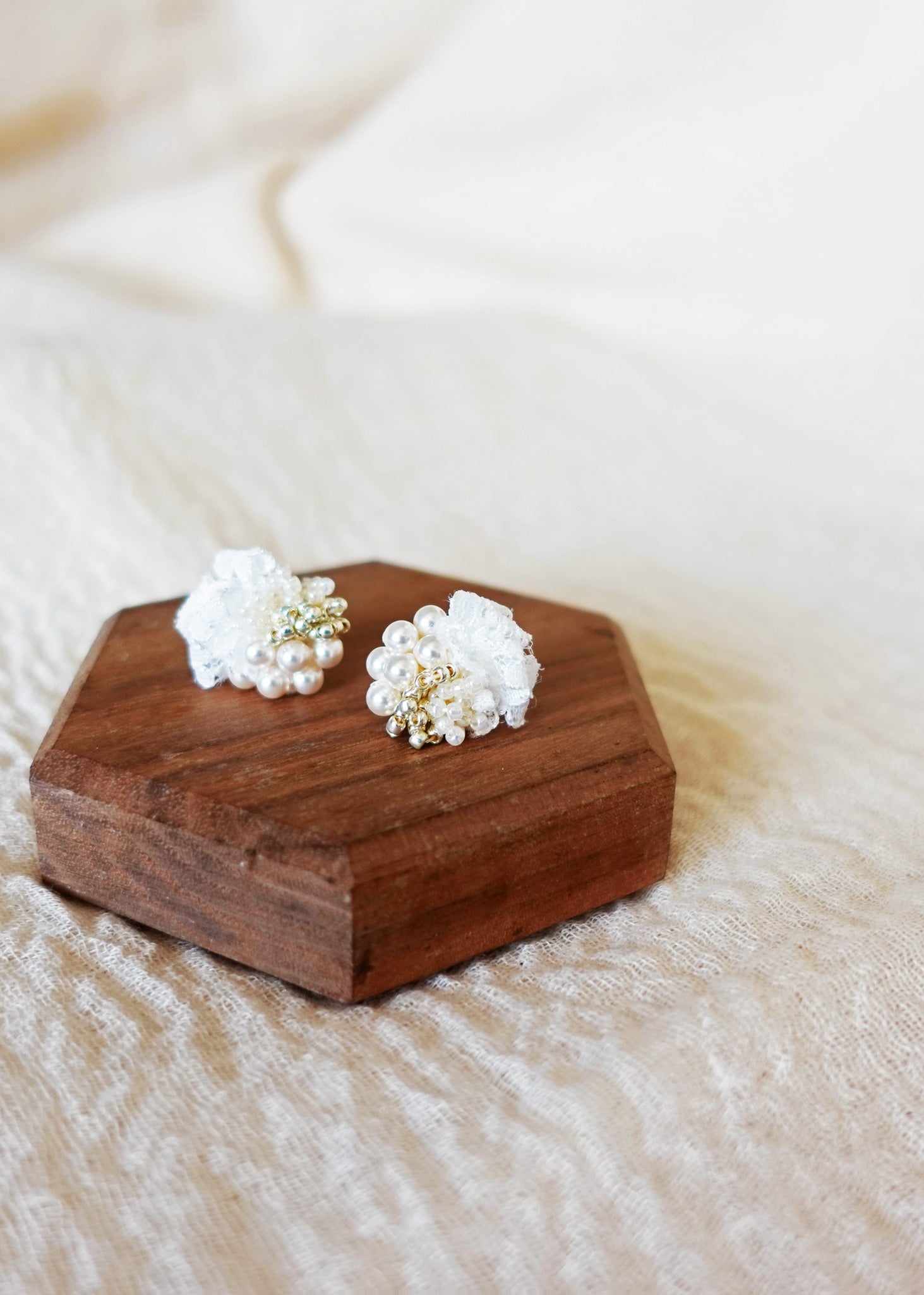 The Pearl Meadow Earrings feature romantic white lace accented with Swarovski pearls and a soft blend of ivory and gold beads. Each piece is delicately made by hand, capturing the serenity of a blooming meadow bathed in gentle light. Elegant and timeless, they embody refined craftsmanship and quiet femininity — a graceful adornment for any occasion.