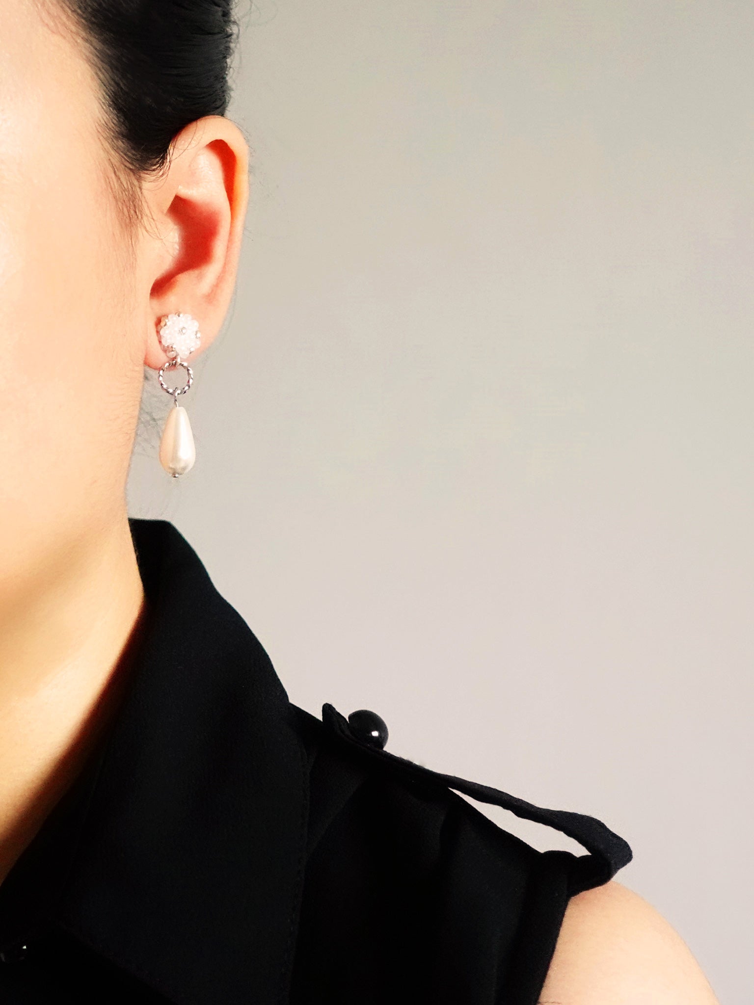 Silver circles adorned with teardrop-shaped crystal pearls dangle elegantly beneath star dust studs.
