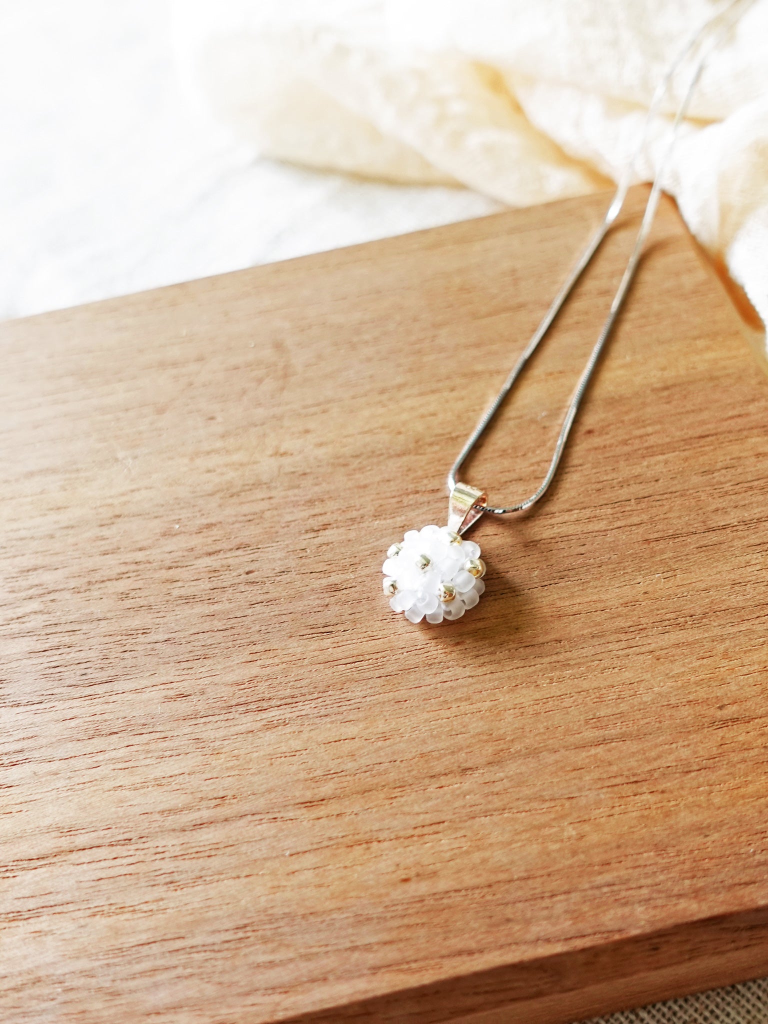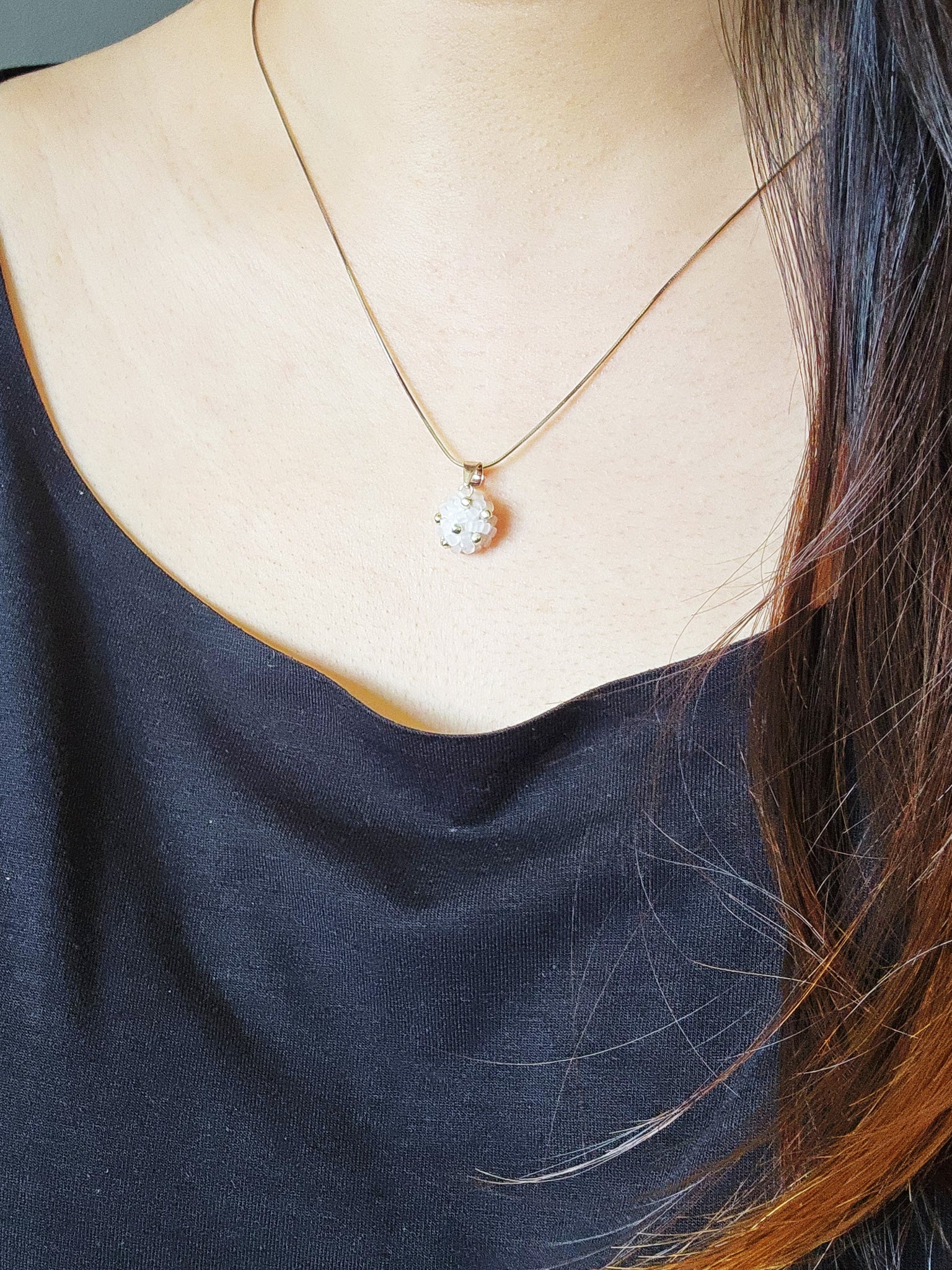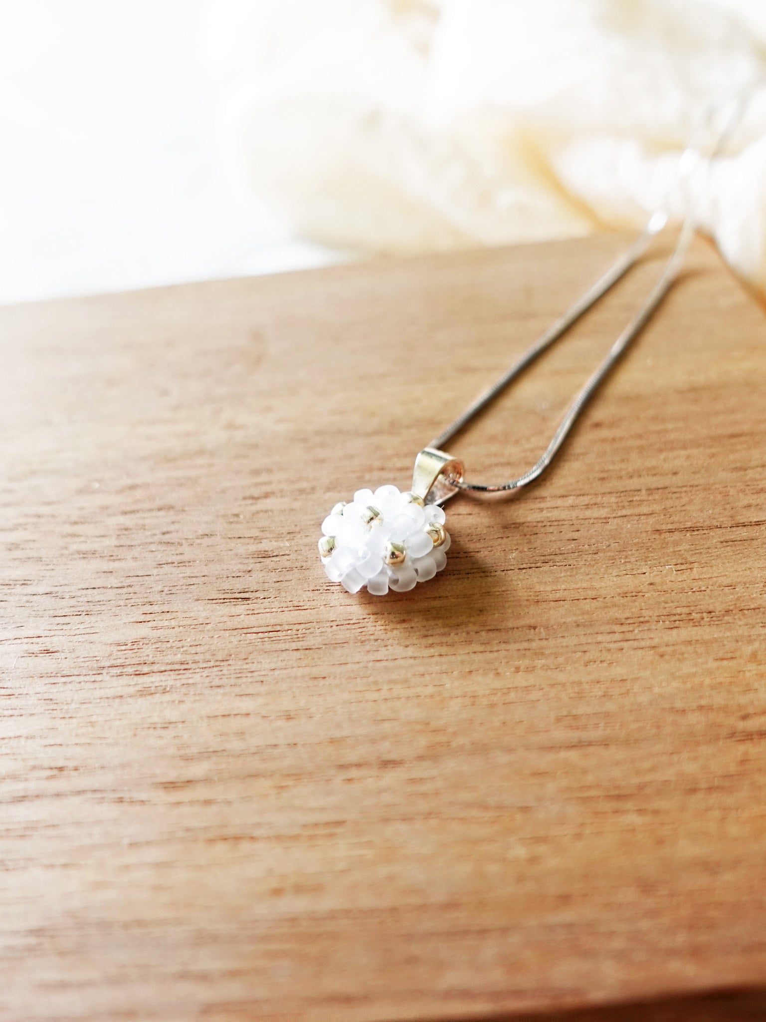 Luminous gold seed beads with lasting shine are crocheted together with a canvas of cloud white. On a sterling silver chain.