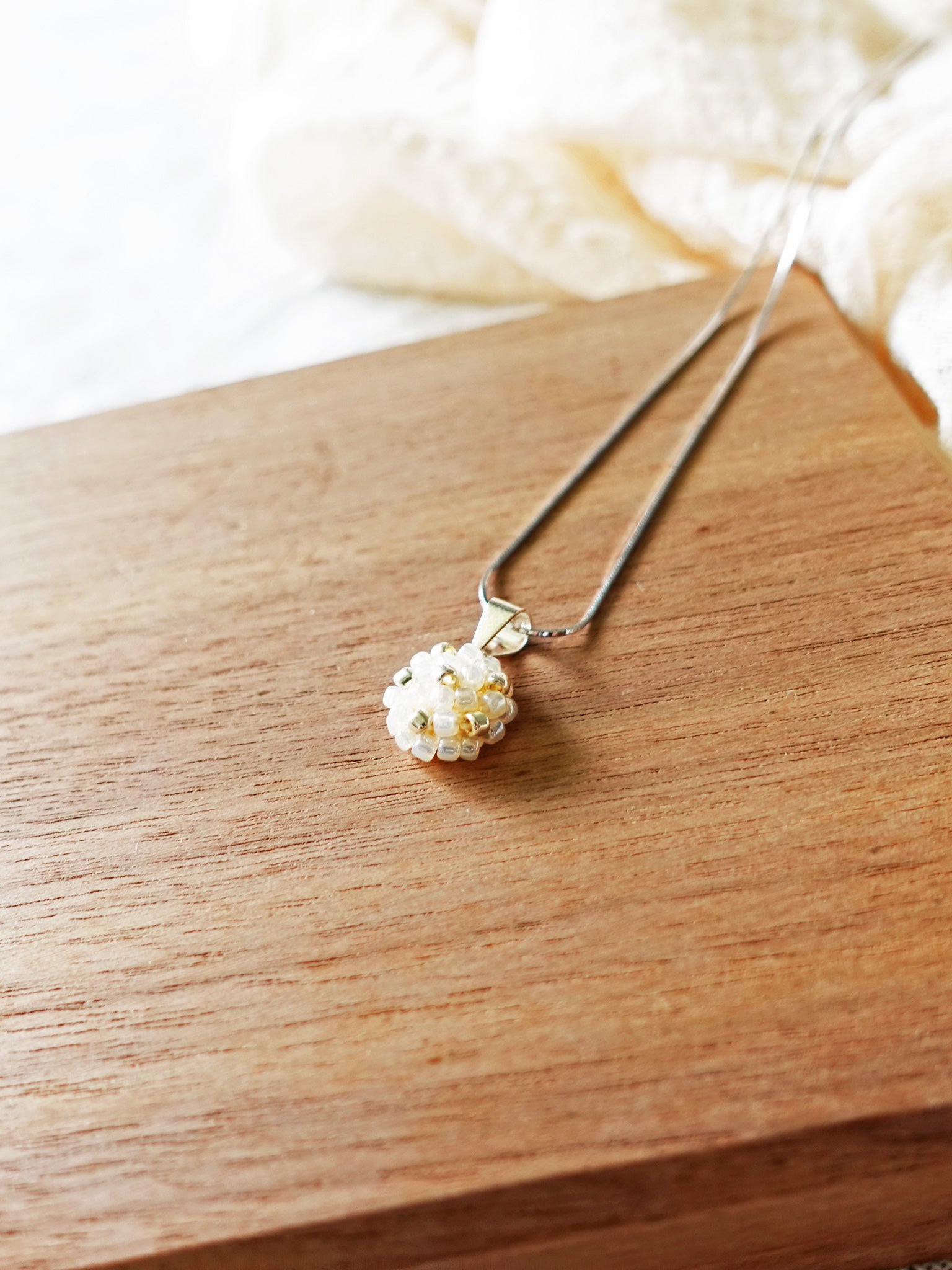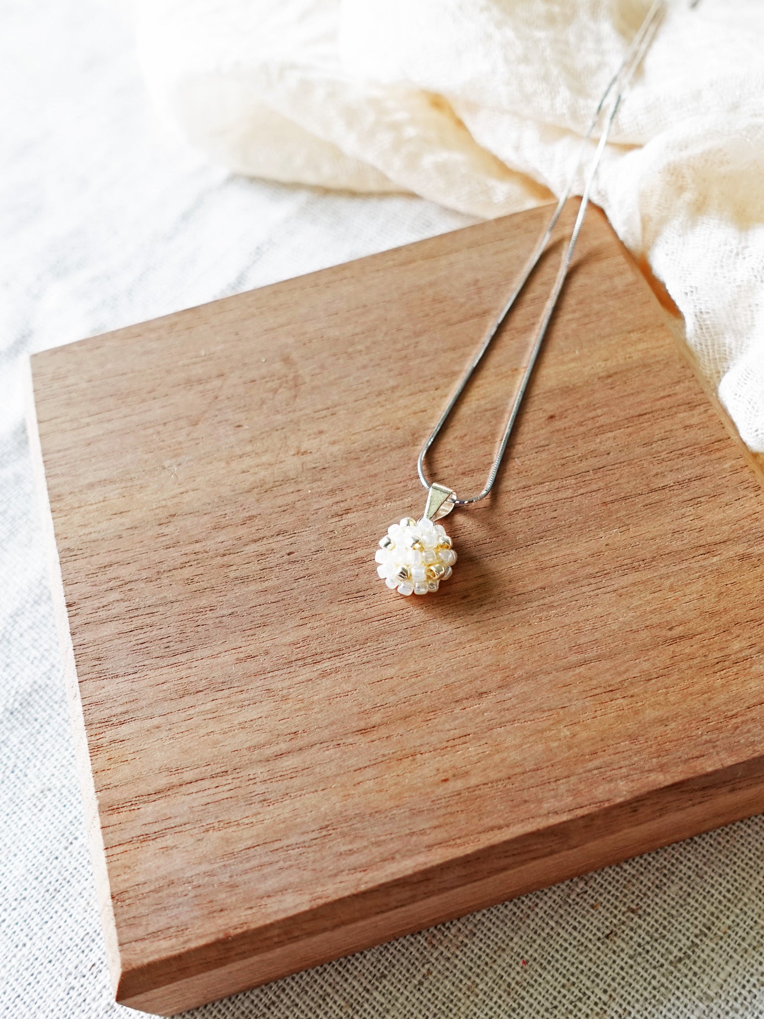 Luminous gold seed beads with lasting shine are crocheted together with a canvas of ivory. On a sterling silver chain.