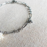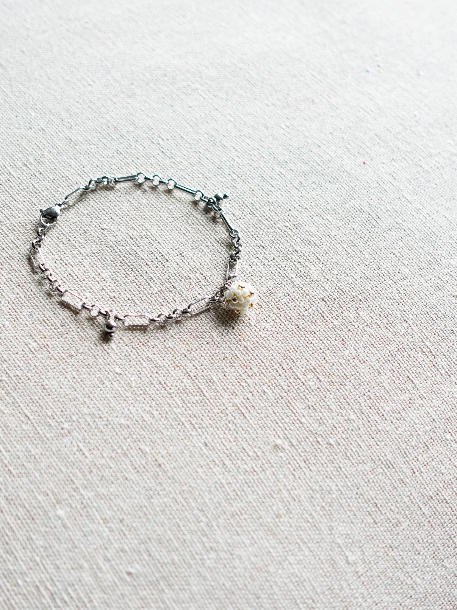 Dainty sweet pea of star dust on pearl white background, embellished with delicate steel balls.