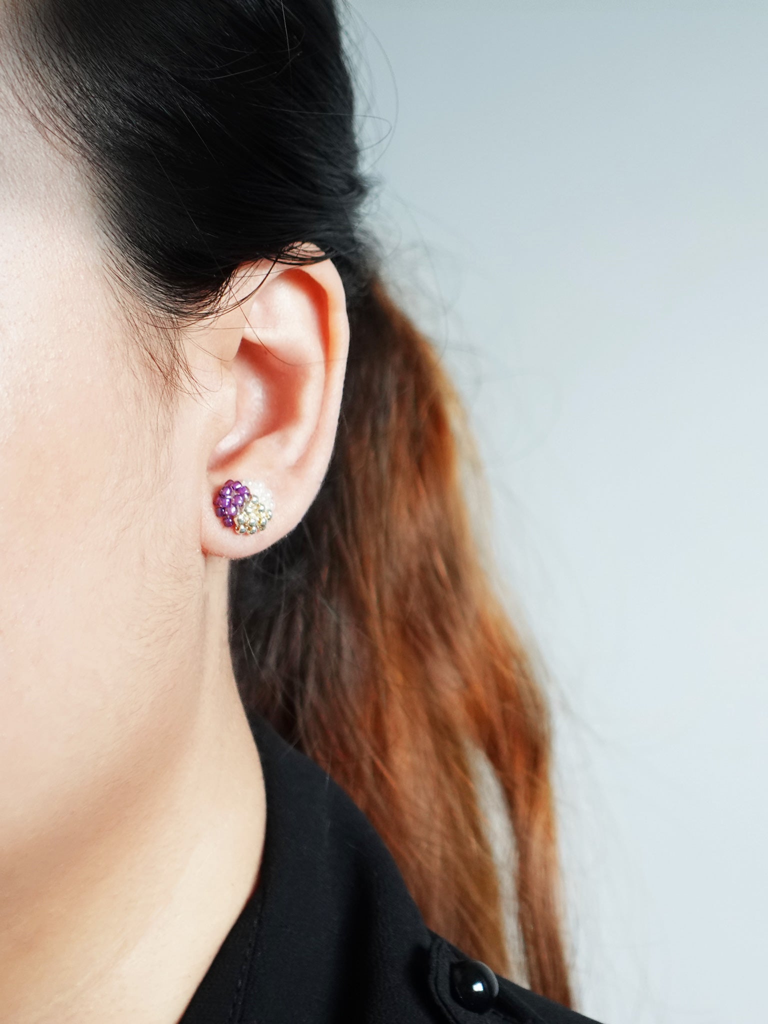 Beaded round studs in colorblocks of royal purple, ivory, and shiny gold colors.